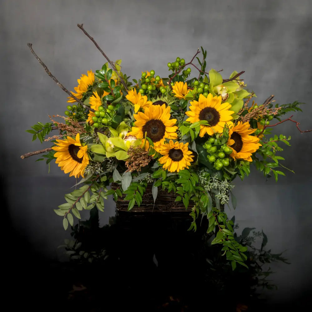 There’s so much about sunflowers that inspire and that’s why we’ve captured it all in one charming basket! Filled with a beautiful mix of yellow and green sunflowers and Cymbidium Orchids, this hand-designed arrangement will inspire your recipient to smile brighter, laugh longer... and delight in the moment forever.
