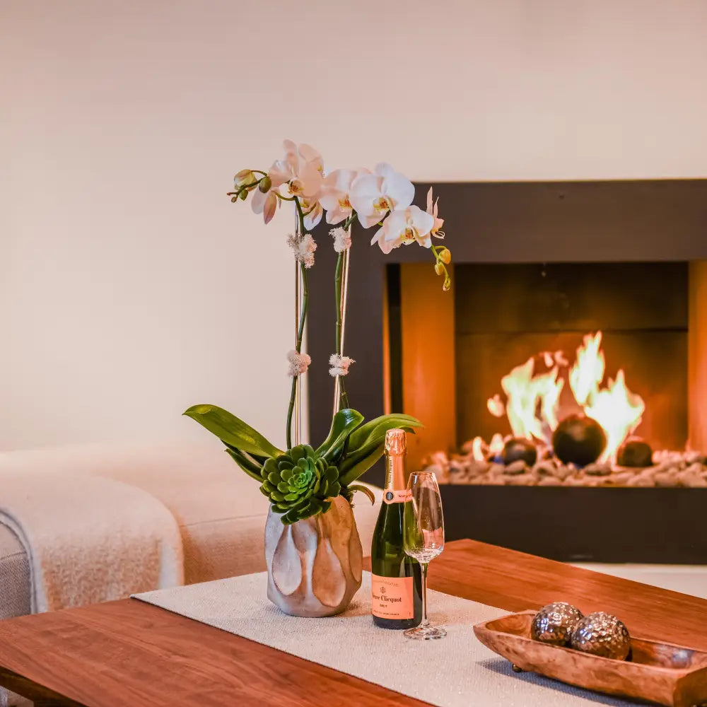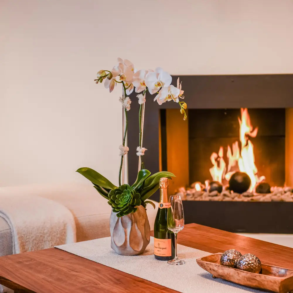 In a serene fusion of elegance and simplicity, behold the ethereal charm of our White Orchid Stem Duo, gracefully ensconced within a sleek, tall ceramic vase. Each stem, adorned with delicate white blossoms, exudes an aura of purity and tranquility, casting a gentle allure that captivates the senses. Standing tall and proud, these majestic orchids bring an air of refined sophistication to any space, evoking a sense of timeless beauty and calm. Whether adorning a modern living room or gracing a serene office corner, let these exquisite blooms illuminate your surroundings with their understated grace and everlasting charm.