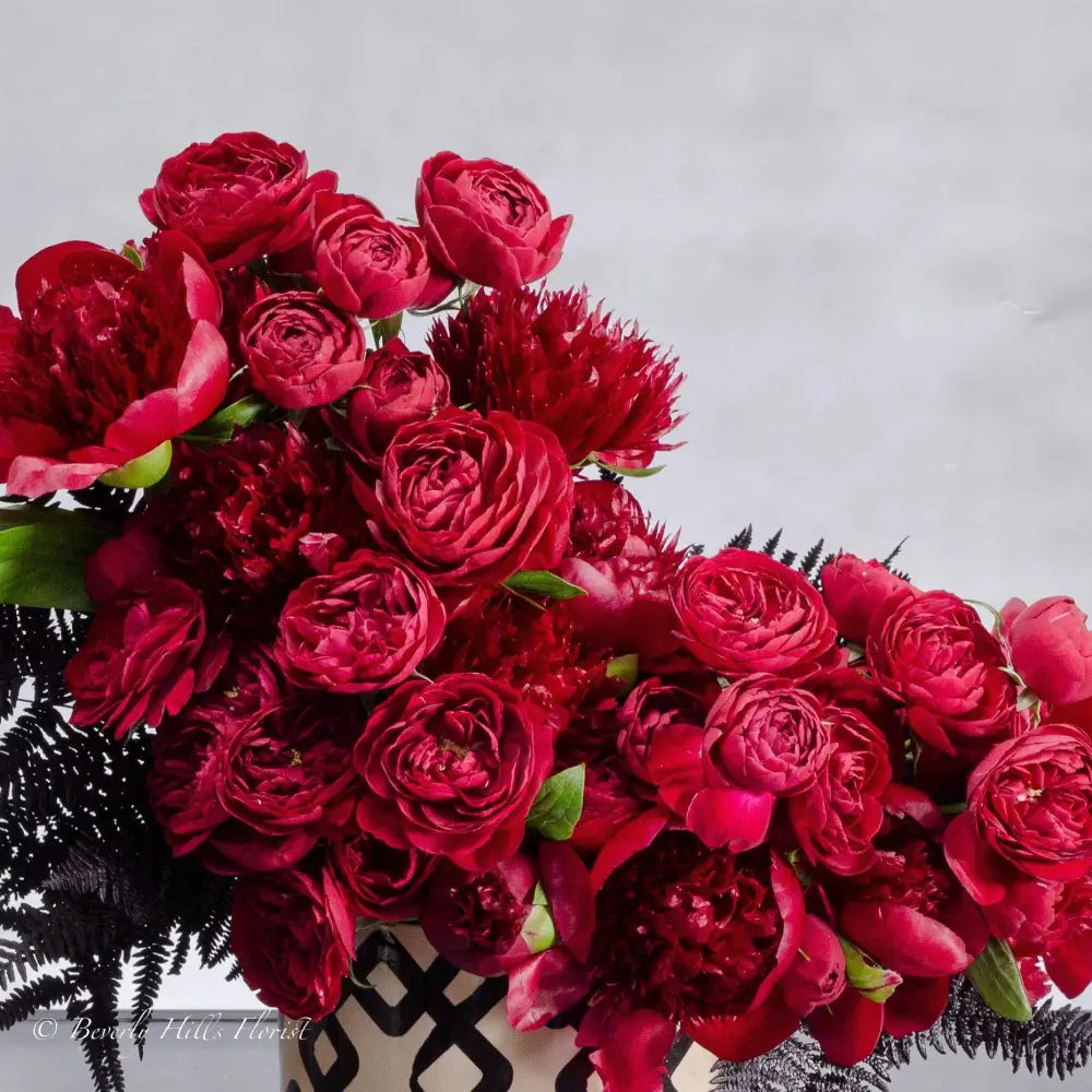 Same day delivery from your local florist! Delight in the ethereal beauty of this luxurious floral arrangement featuring 50 stems of white and blush peonies. Housed in an elegant 12-inch pedestal vase with rock accents, this ensemble exudes sophistication and grace. The striking display showcases the delicate peony stems exposed, creating a visually captivating arrangement that seamlessly balances compact elegance with abundant beauty. Elevate your space with this stunning centerpiece that captures the essence of timeless charm and natural elegance