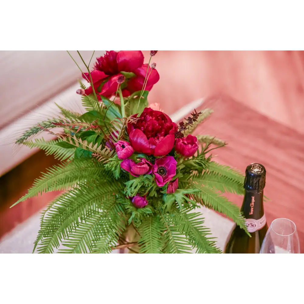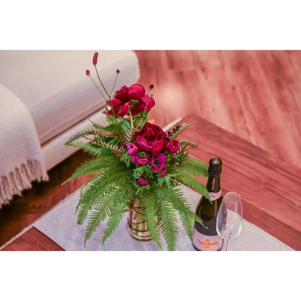 Introducing our tall, short Pink Peony Ensemble, a vibrant fusion of elegance and seasonal flair. In a small, tall glass vase, hot pink peonies stand tall amidst seasonal greens and accent florals. Perfect for any space needing a burst of color and charm, this arrangement exudes sophistication and vitality.