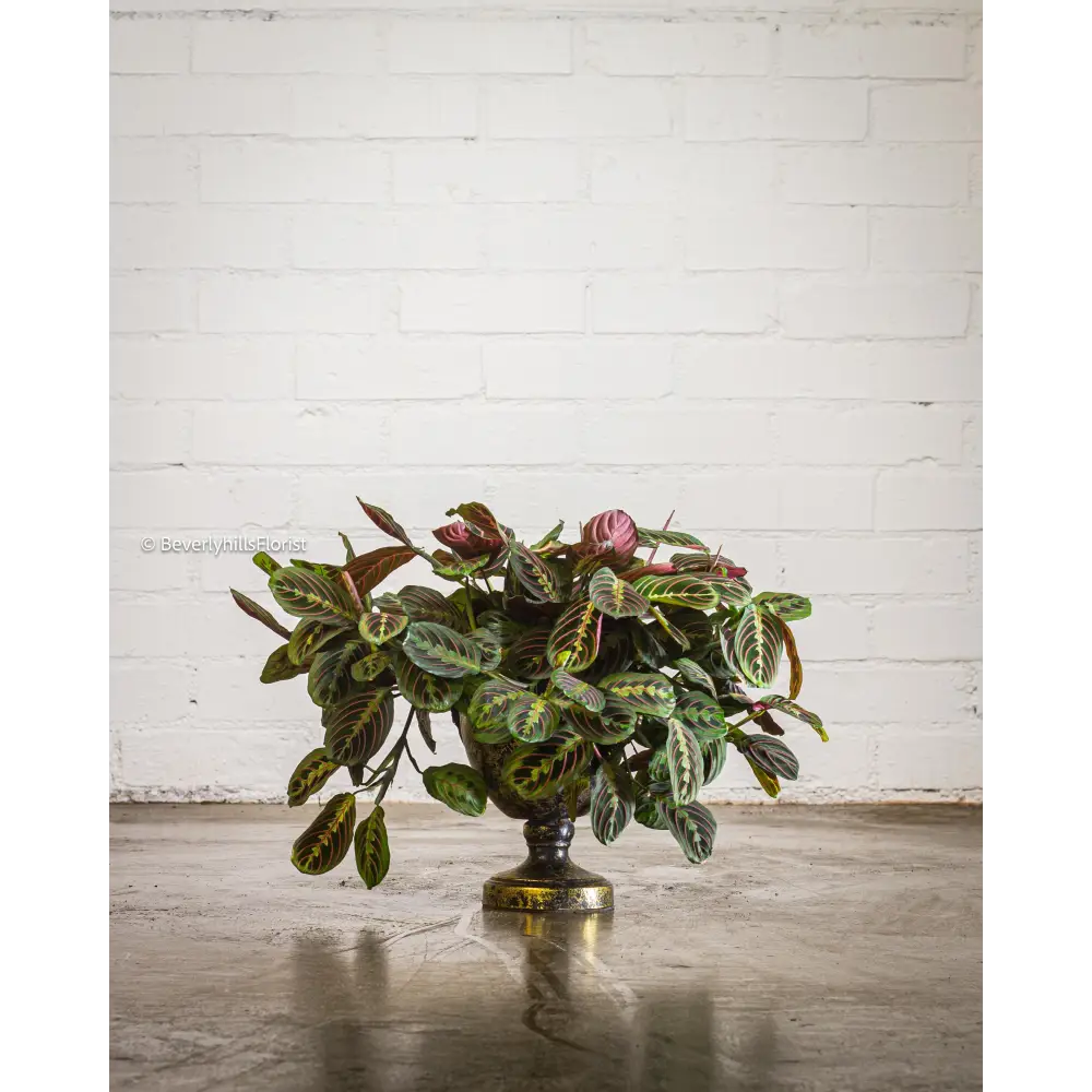 A singular plant flourishes within a lavish petal vase, its lush foliage adorned with a mesmerizing array of red hues. The multiple leaves cascade gracefully, creating a captivating display of natural beauty. Each leaf boasts vibrant red tones, evoking a sense of warmth and vitality. Set against the opulent backdrop of the gold vase, this botanical masterpiece exudes an aura of sophistication and luxury, infusing any space with a striking focal point of color and elegance.