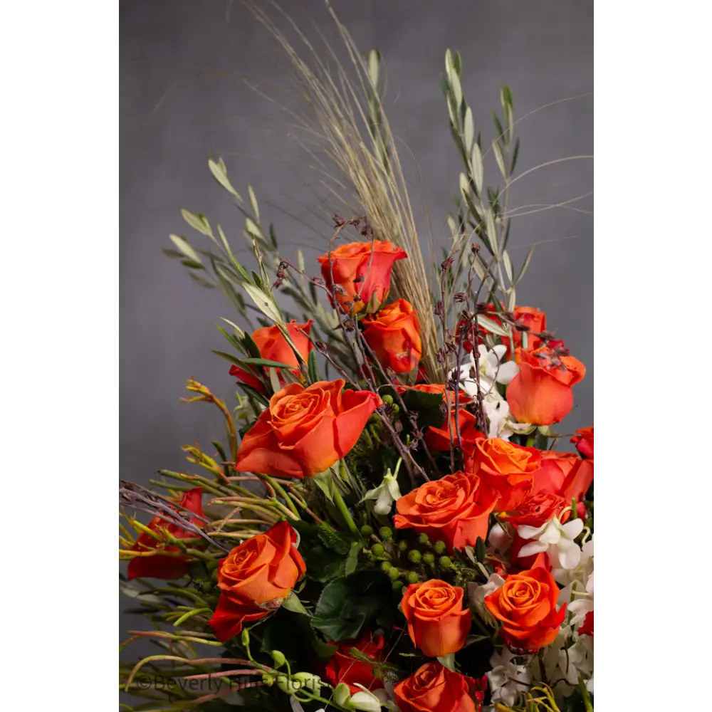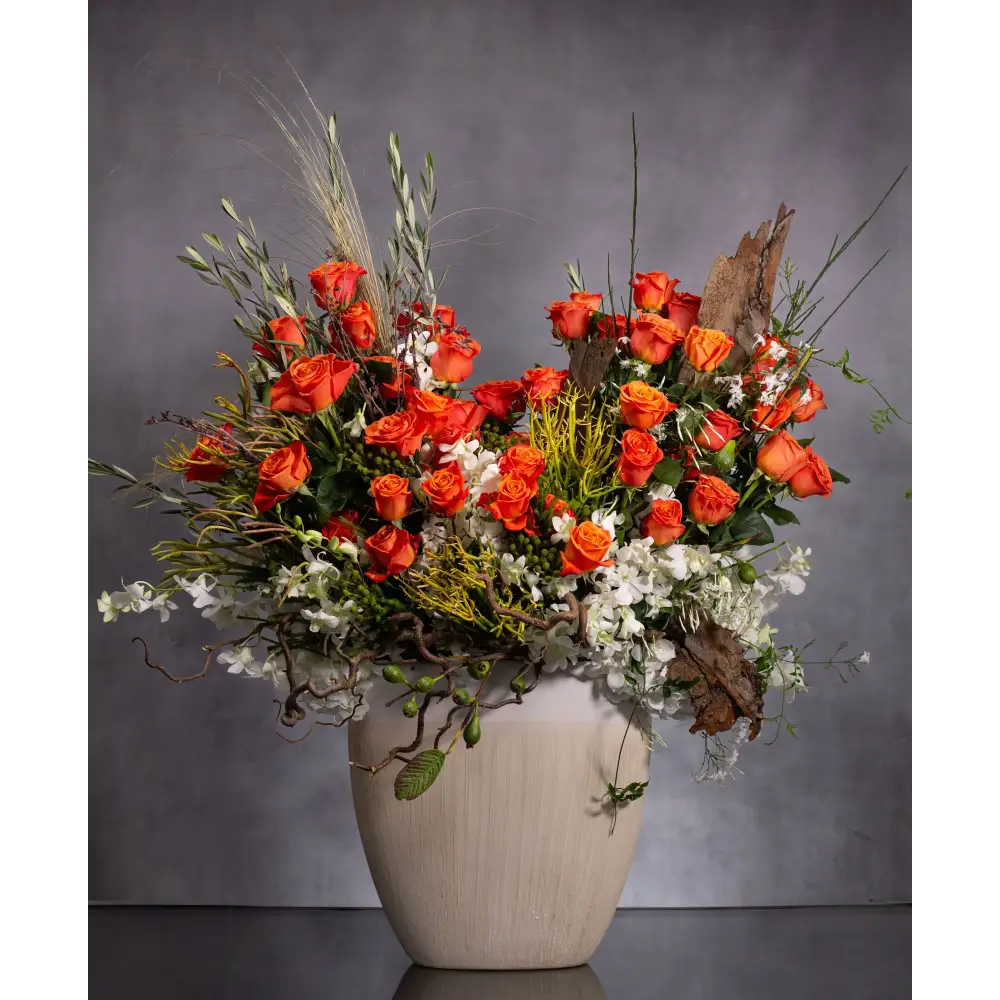 Step into a realm of untamed elegance with our 'Wildwood Wonder' arrangement. Rising tall in a cream ceramic vase (2ft tall), this majestic display intertwines seasonal natural elements with bursts of captivating orange roses. The arrangement reaches a height of 4.5 feet and spans a width of 2 feet, evoking the spirit of wilderness and allure. It's a grand masterpiece that brings the enchantment of nature indoors, transcending seasons and captivating hearts with its wild beauty.