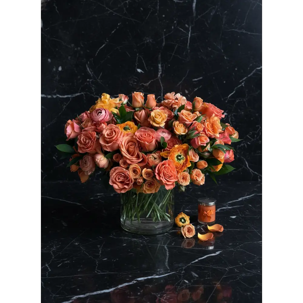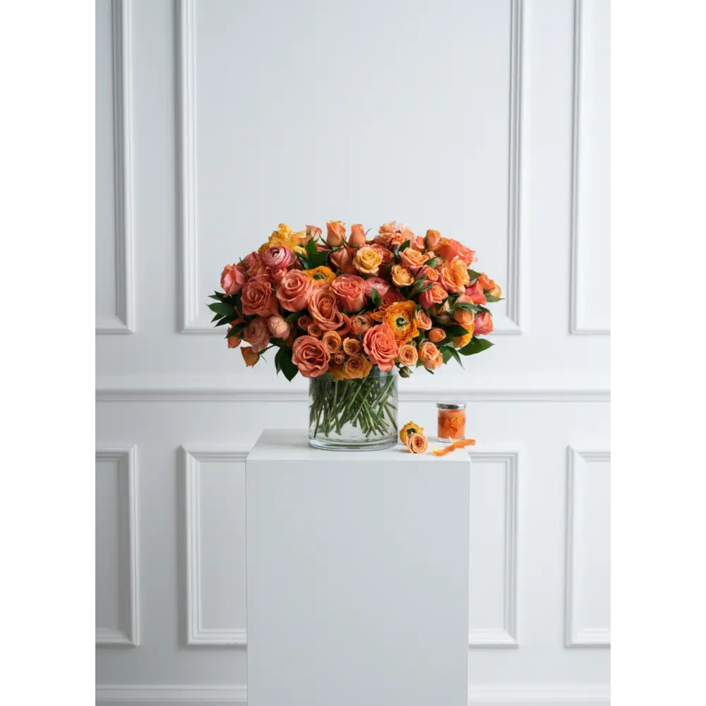 “Orange You Pretty” is a fresh and modern floral design featuring vibrant orange roses artfully arranged in a clear glass vase. Accented with seasonal blooms and finished with orange spray roses, this radiant arrangement offers a refined balance of warmth, texture, and movement. Designed to feel full, elegant, and effortlessly chic, it is perfect for celebrations, thank-you gestures, birthdays, and stylish everyday moments.