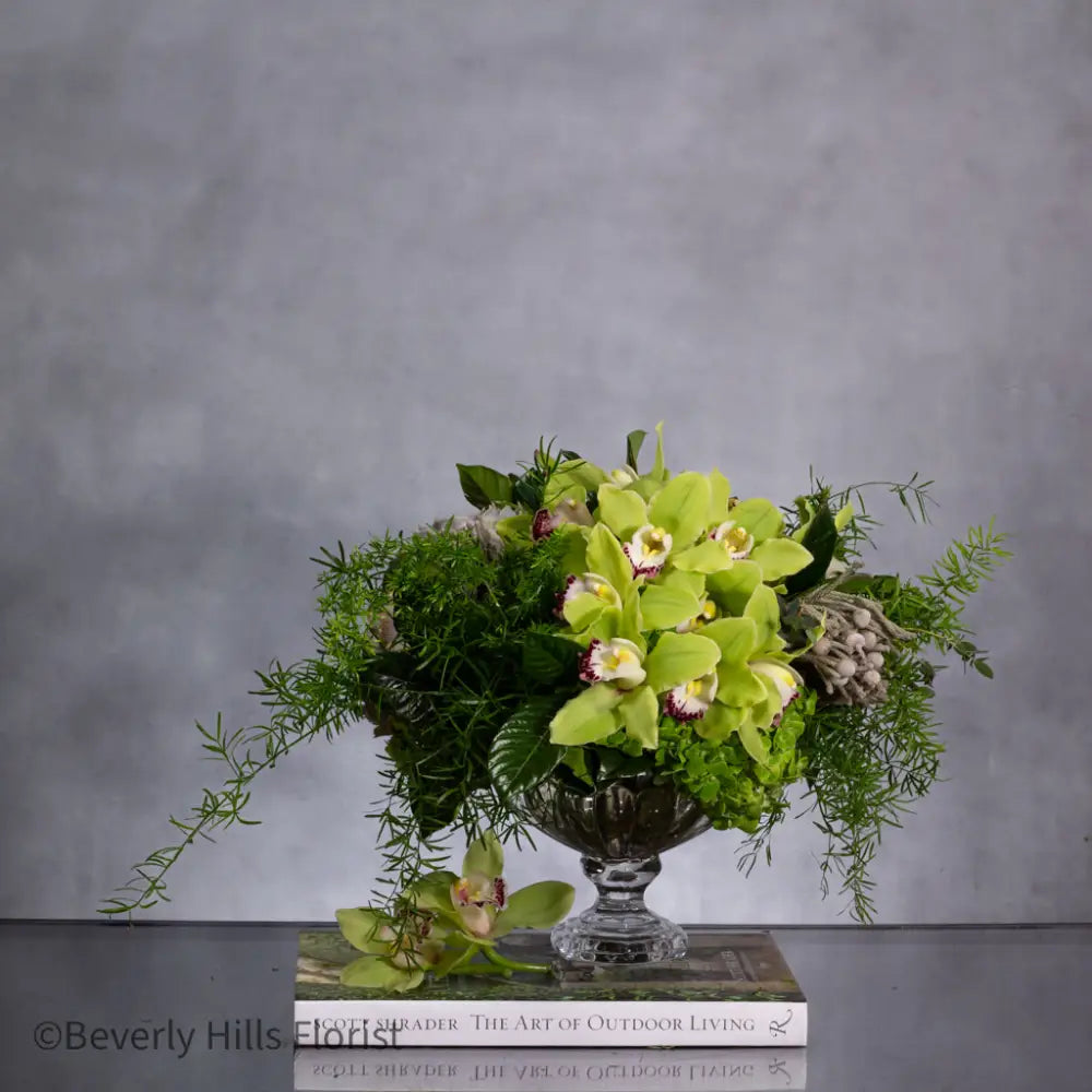 Introducing 'Whispering Meadows', a tranquil sanctuary crafted to soothe the senses and elevate any space with its calming presence. Encased within a short glass vessel, this exquisite arrangement showcases a delicate dance between pristine white florals and the captivating allure of green cymbidium orchids, creating a harmonious blend that embodies elegance and serenity. Each bloom whispers of the meadows' gentle embrace, evoking a sense of peace and tranquility that transforms your environment into a peaceful retreat. As a luxury florist in Beverly Hills, we take pride in curating floral designs that not only delight the eye but also provide a soothing experience, perfect for elevating any occasion or space. Our flowers in Beverly Hills are available with same day delivery, ensuring that your thoughtful gift or decor arrives promptly and in pristine condition. The arrangement, like a secret whispered among the grasses, invites you to lose yourself in its ethereal beauty, offering a timeless elegance that enhances your surroundings. Whether for a special event or a personal indulgence, Whispering Meadows embodies the perfect harmony of nature’s finest elements, bringing a touch of serenity and sophistication to your life.