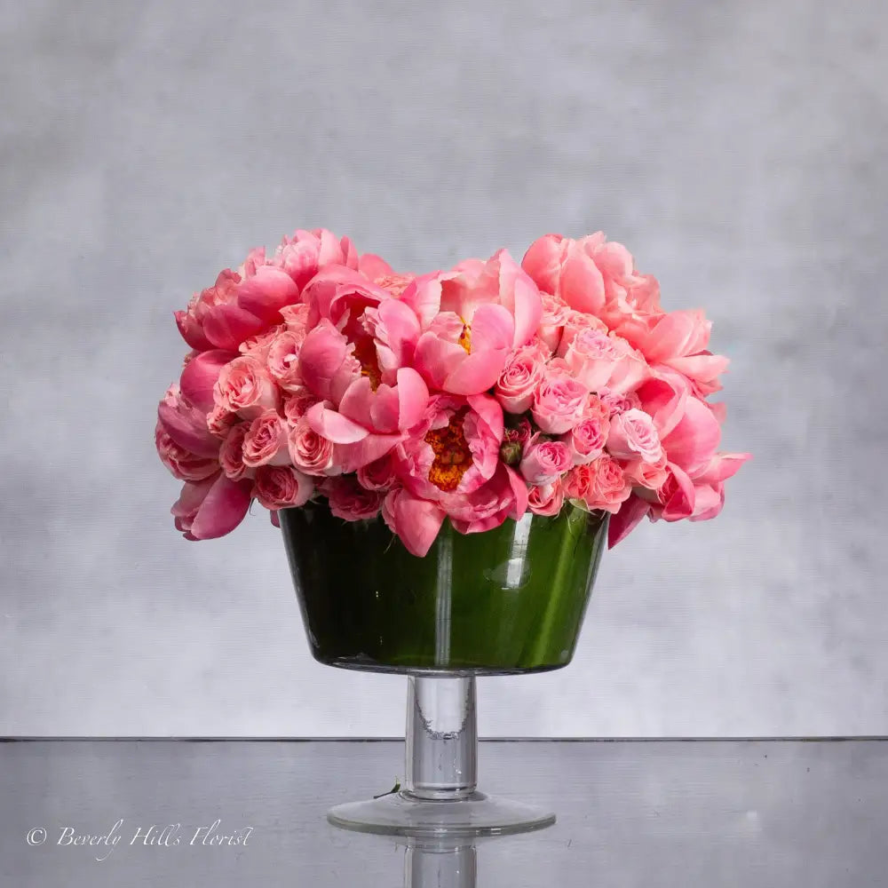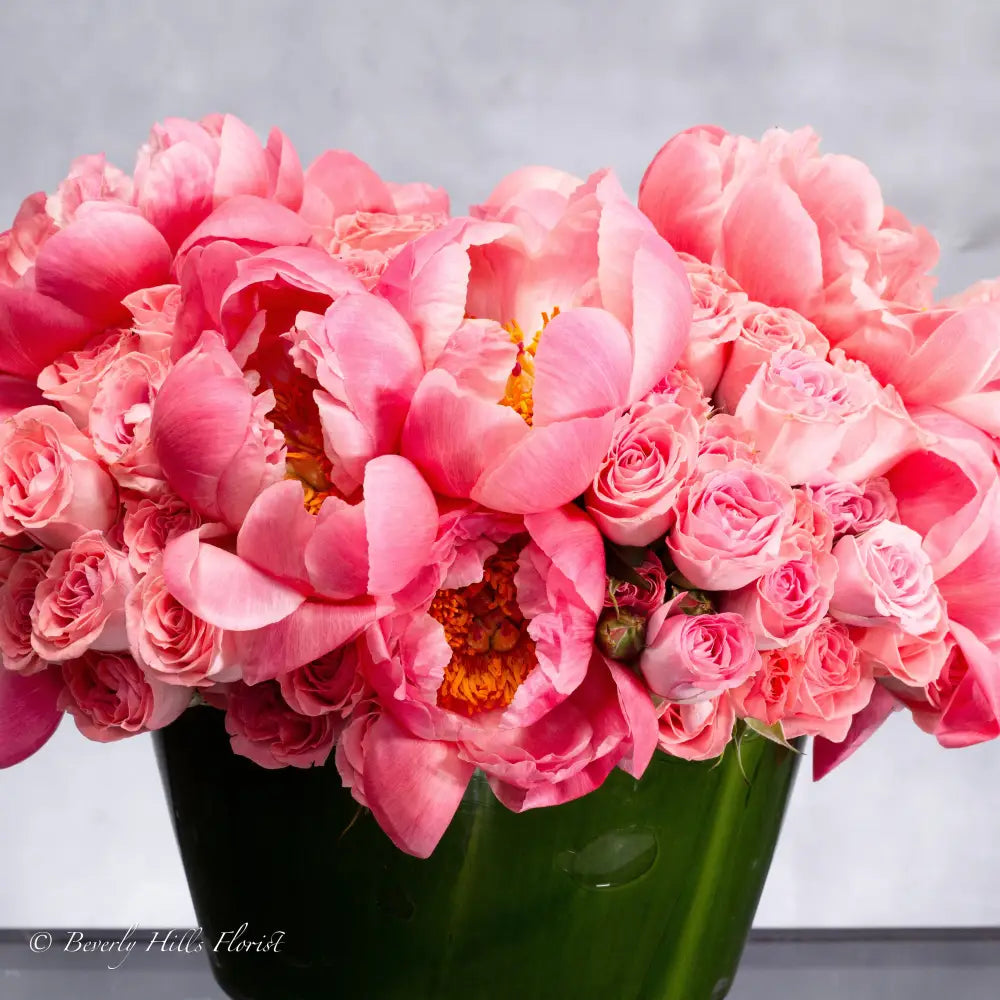 Experience the enchantment of "Coral Bloom Fusion" from Beverly Hills Florist—a lavish arrangement of coral peonies and pink spray roses, enhanced with a dozen exquisite peonies. Nestled in a pedestal vase, this display adds timeless elegance to any setting, transforming your space into a floral paradise. Available in sizes from Petite to Grand, each upgrade adds more flowers and a larger vase for an even more opulent presentation. Perfect for same-day delivery.
