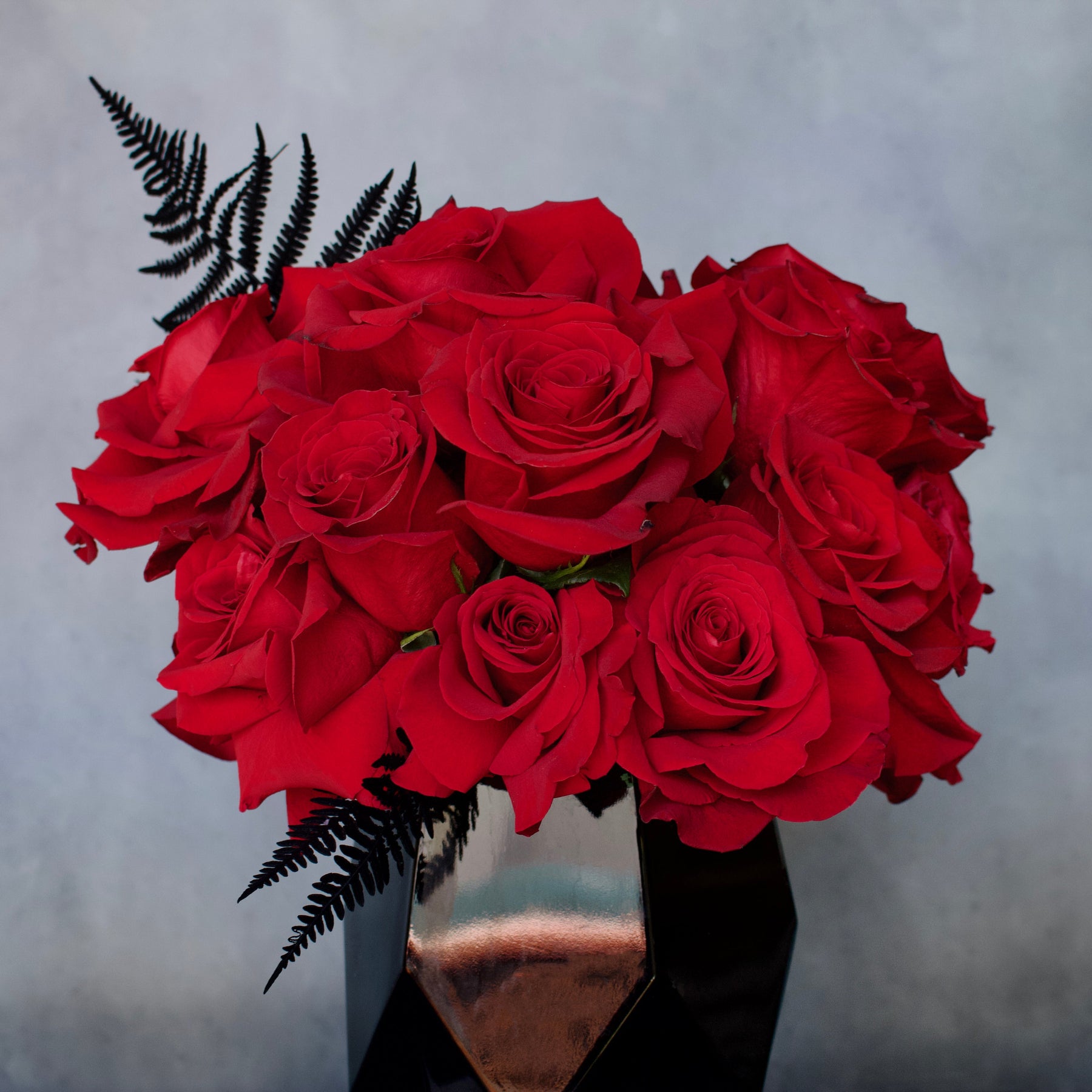 Send red roses to the one who's always on your mind. This lovely modern arrangement nested in a black glass geometric vase will catch anyone's attention.