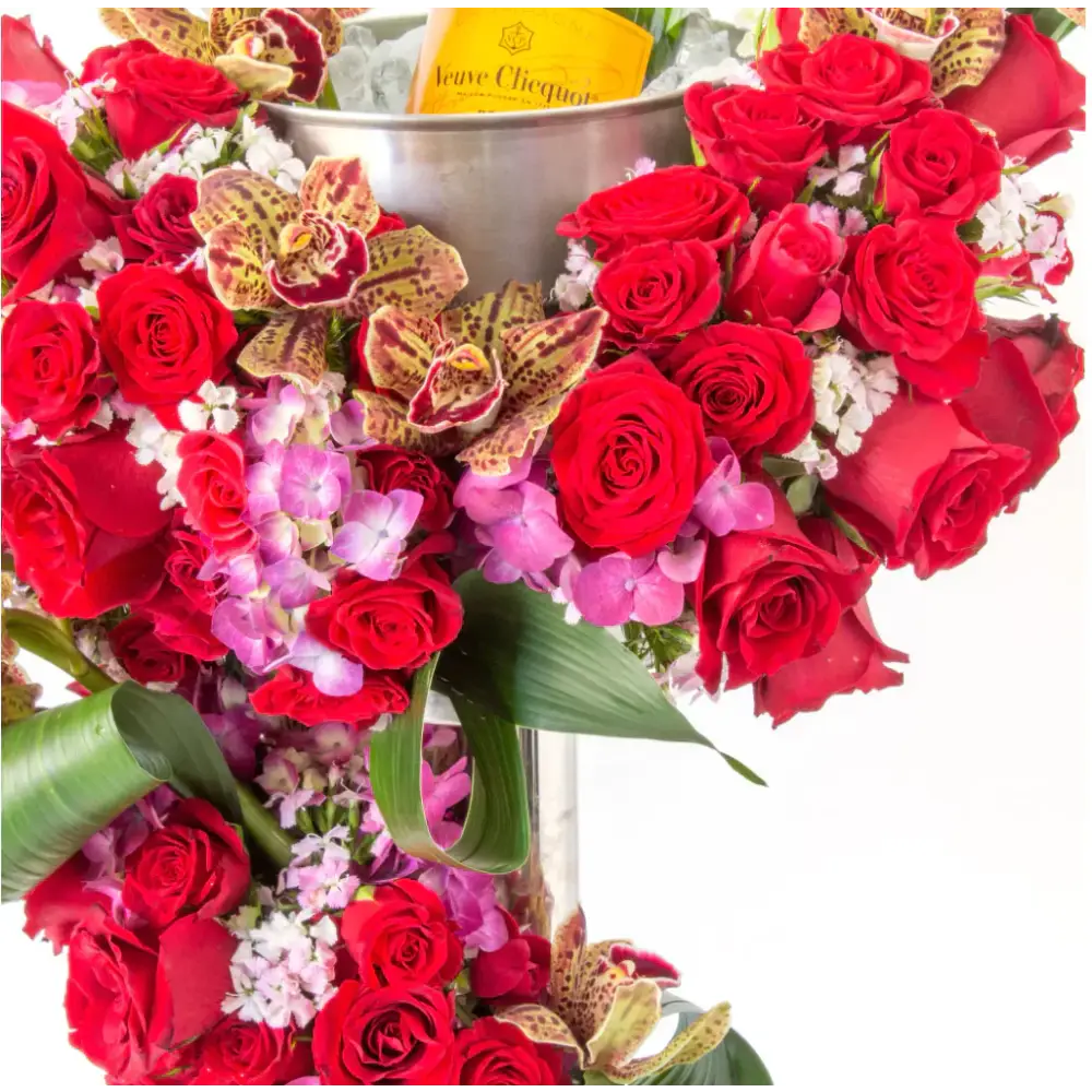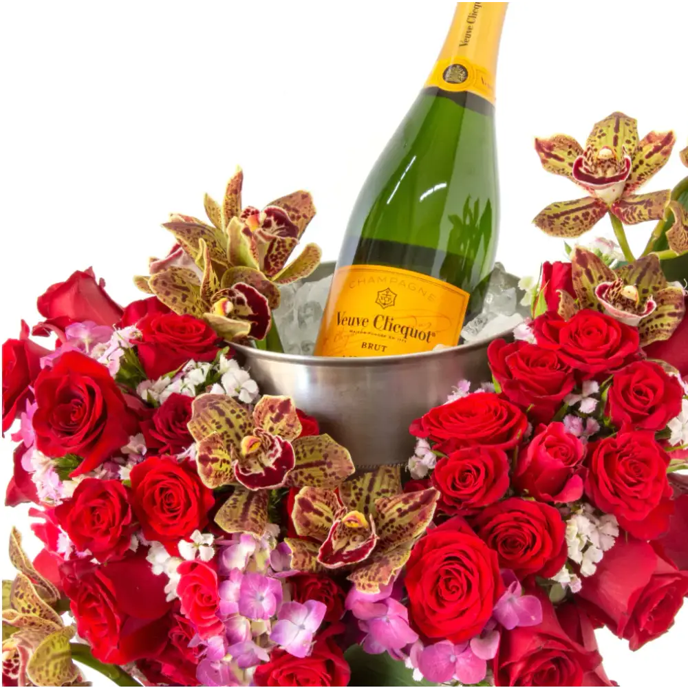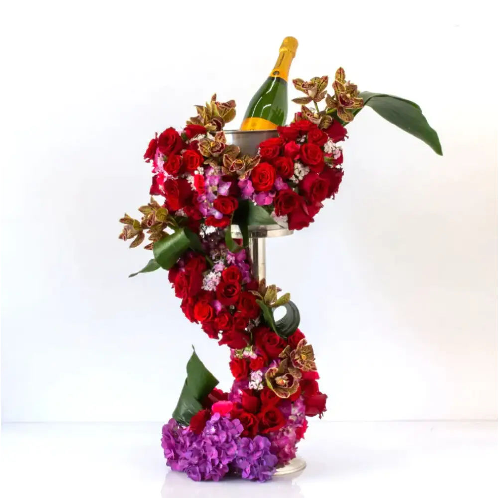 Beverly Hills Florist presents a charming yet dramatic floral statement designed to impress. A refined champagne wine bucket and stand is artfully incorporated into an opulent arrangement of premium roses, elegant orchids, and lush hydrangeas.