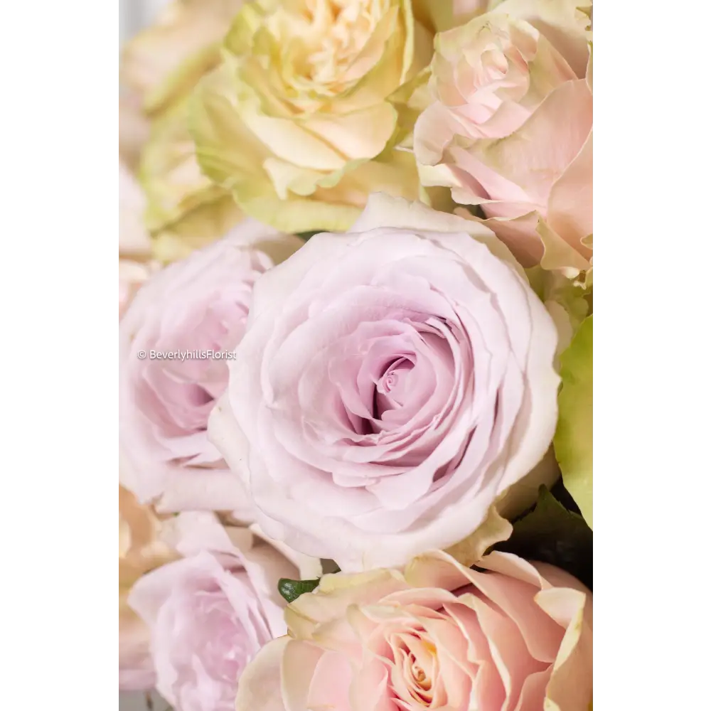 In a pristine white vase, a delicate array of over 70 pastel roses blooms with ethereal beauty. Each petal whispers softly in shades of pale pink, soft lavender, and gentle peach, evoking a sense of tranquility and grace. This enchanting arrangement exudes a serene elegance, bringing a touch of serenity and sweetness to any setting.
