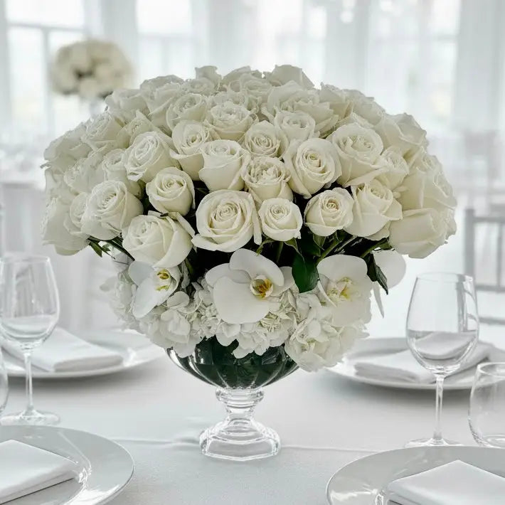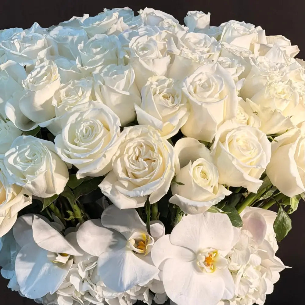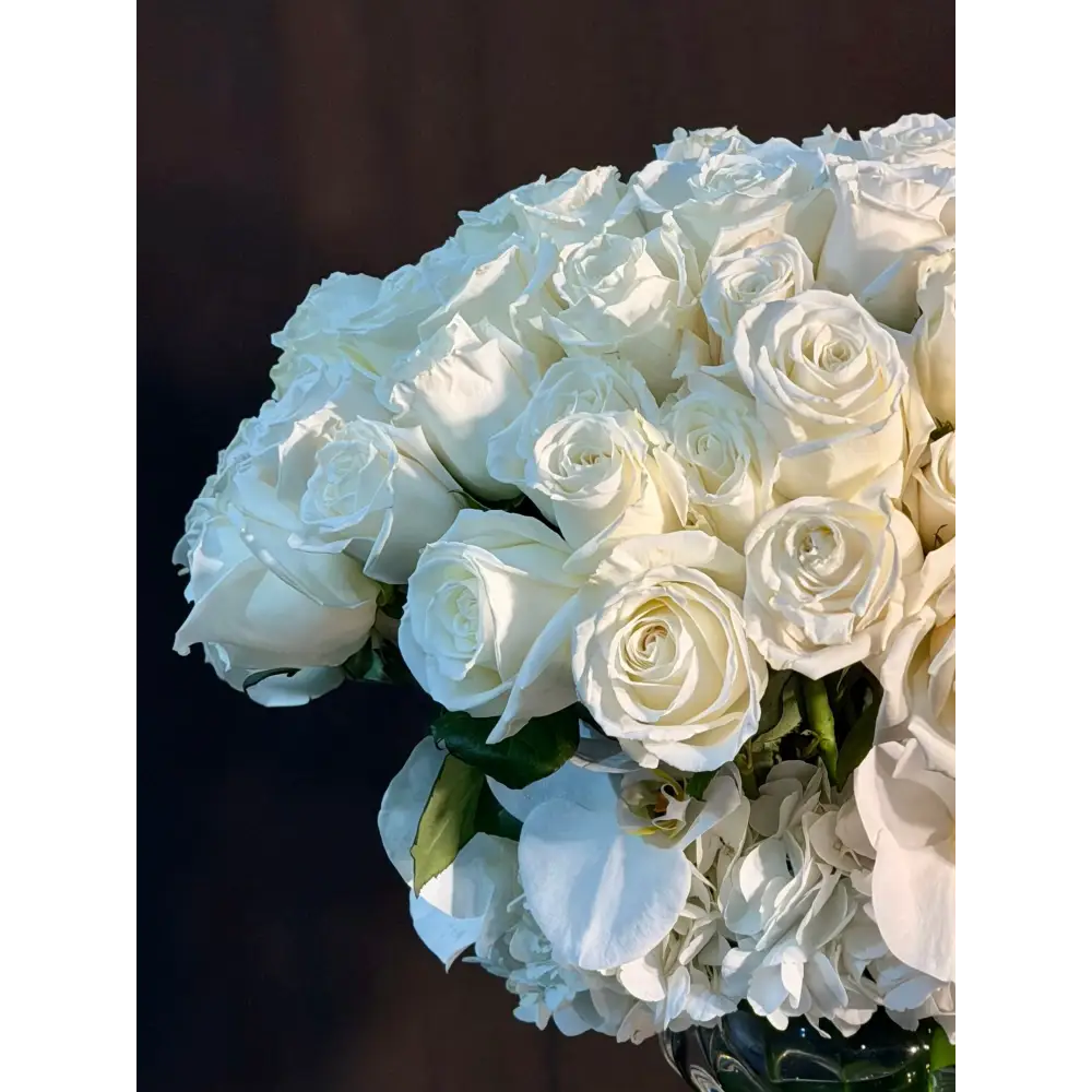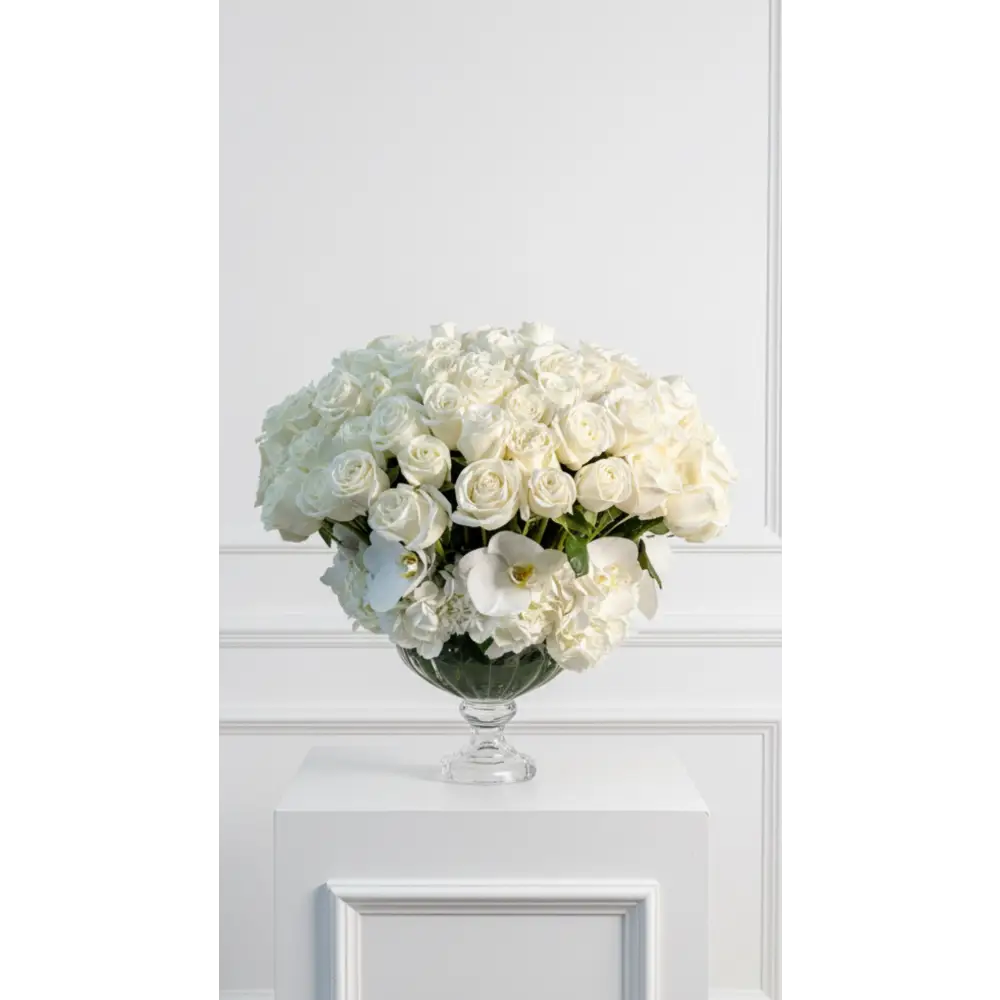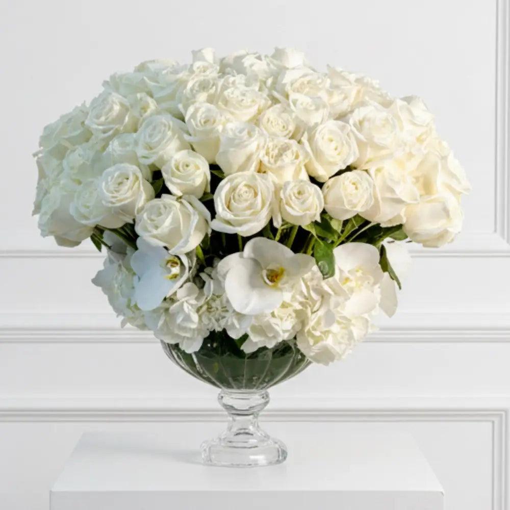Beverly Hills Florist presents a luxurious arrangement of 100 premium white Ecuadorian roses, designed in a shorter, fuller style and accented with elegant orchid blooms for a refined, couture finish. Arranged in a clear glass vase, this timeless composition embodies understated luxury and classic sophistication.