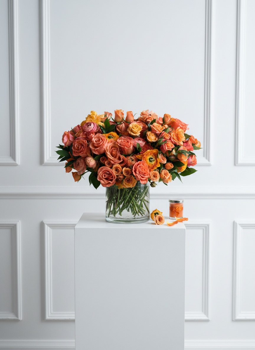 "Orange You Pretty" is a fresh and unique take with orange Roses and a clear vase. Accented with seasonal flowers. Mixed in this arrangement is also orange Spray Roses to finish off the look.