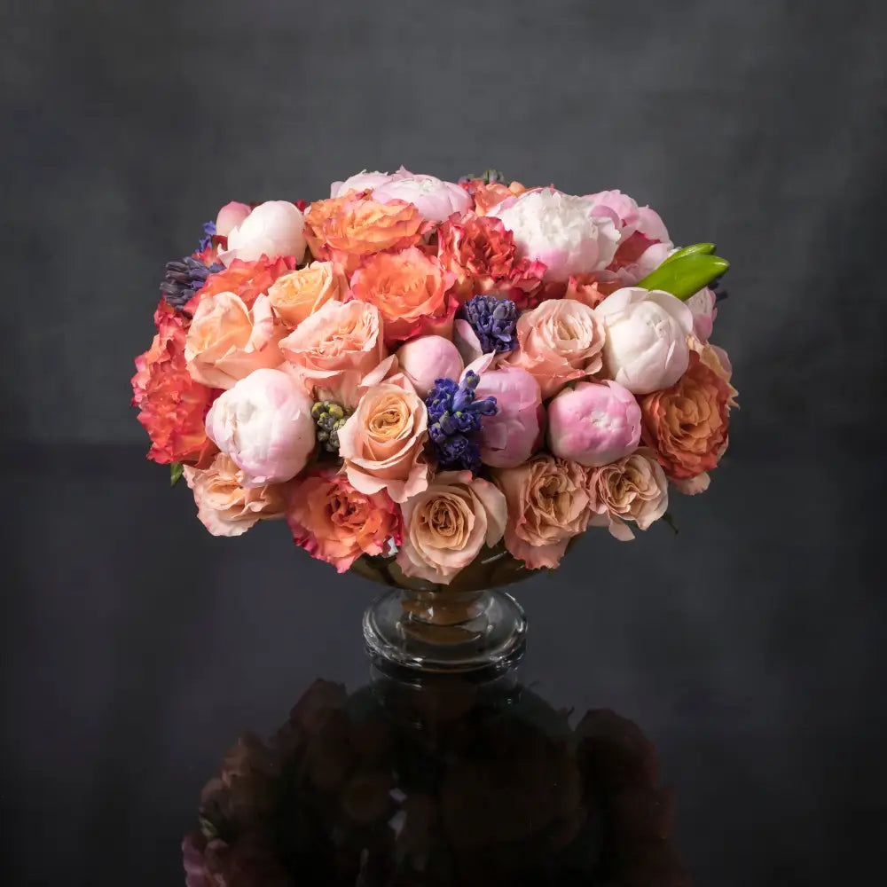 Beverly Hills Florist offers same day delivery! Luscious spring-colored blooms highlight this lovely and abundant arrangement. Gorgeous coral and peach Roses, light colored peonies, seasonal flowers in shades of pink, orange, purple combine into one special and delightful design that will touch the heart.