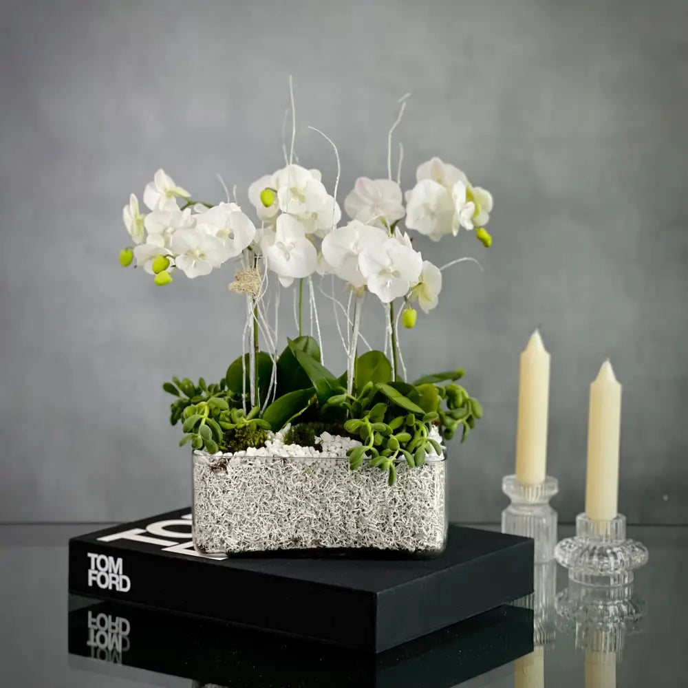 5 White Orchids in a Modern Low profile Square glass container decorated with white moss and White Marble.