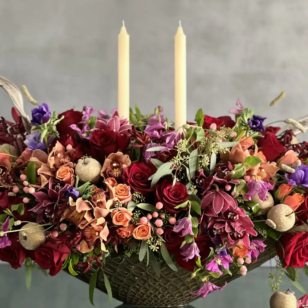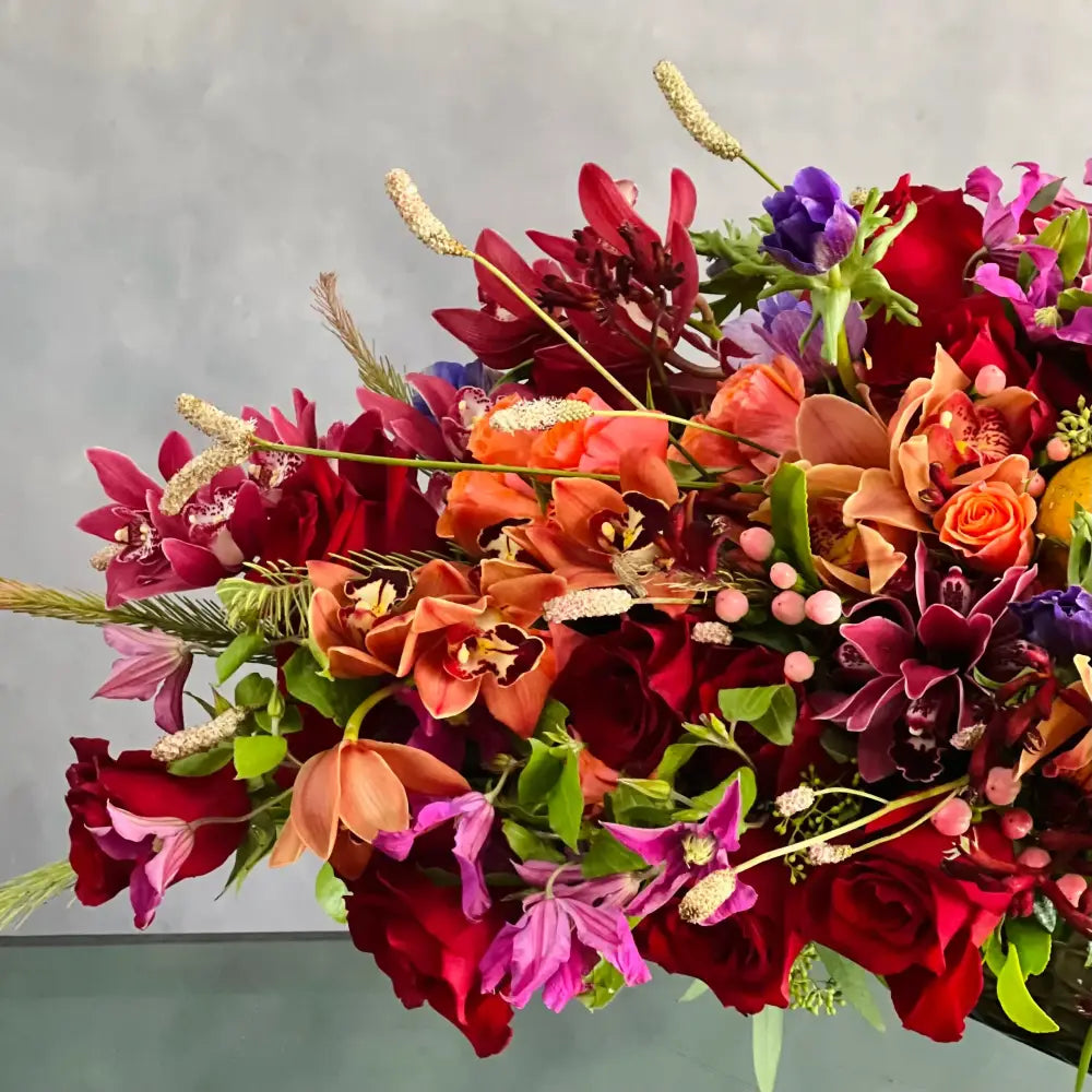 The abundance of orchids, roses, coffee beans, and festive accents makes this large centerpiece a focal point on any table. Indulge in a feast for the eyes with an abundance of orchids, roses, coffee beans, and festive accents. This large centerpiece is sure to be the talk of the table.