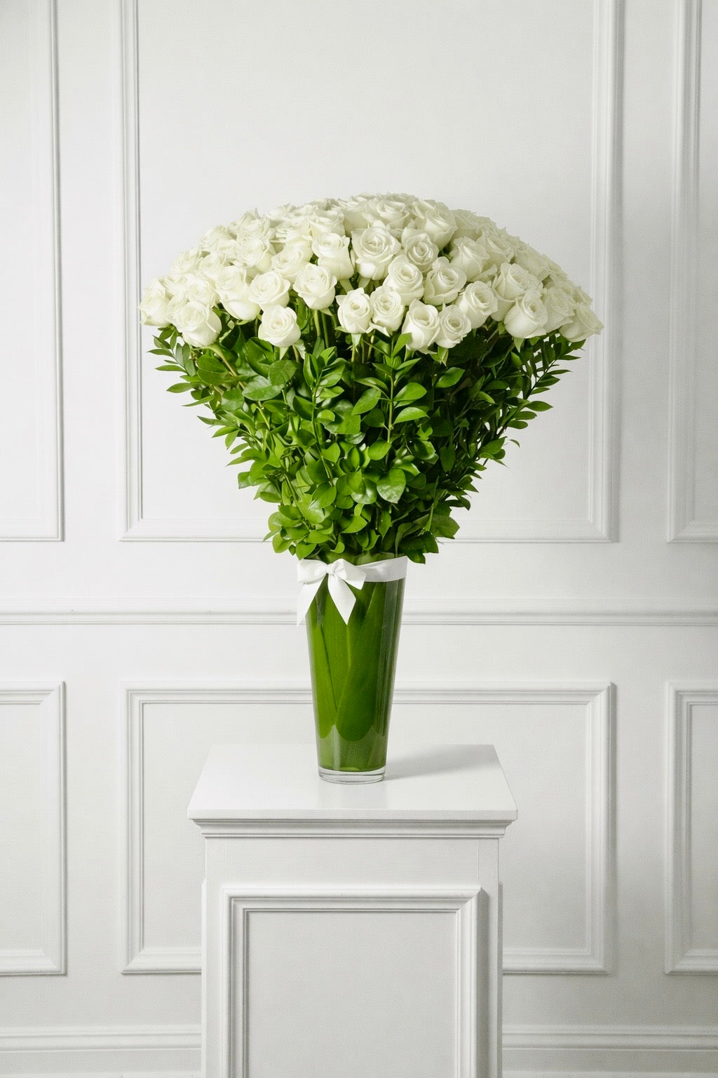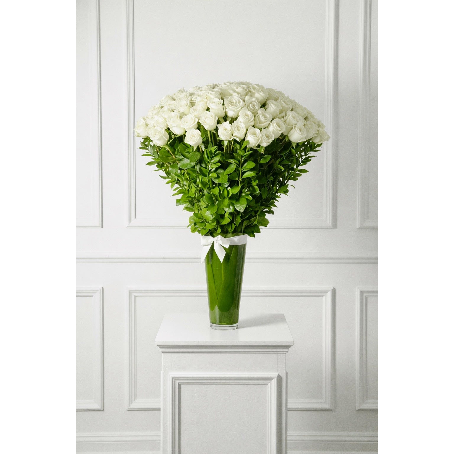 Beverly Hills Florist presents a timeless arrangement of premium white Ecuadorian long-stem roses, accented with fresh seasonal greens and arranged in a clear glass vase.