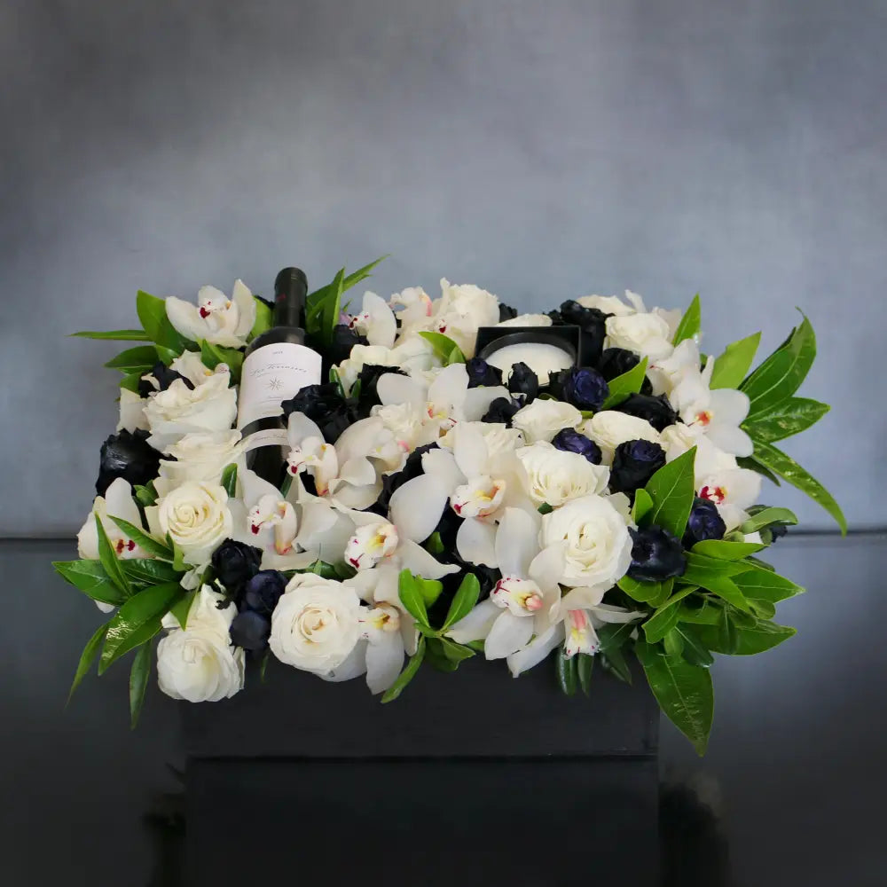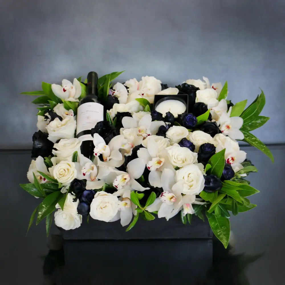 A Gift For You is a timeless and luxurious floral arrangement, showcasing the elegance of black and white roses combined with stunning white cymbidium orchids. Nestled among lush greens and arranged in a sleek black wooden box, this arrangement exudes sophistication. Accompanied by a fine bottle of wine and a candle, it’s a perfect gift for celebrations, anniversaries, or any special moment. Hand-delivered with care, this chic and stylish arrangement adds a touch of luxury to any occasion, and with same-day delivery from Beverly Hills Florist, it's sure to impress.