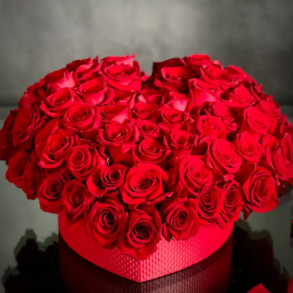 Dozens and dozens of gorgeous bright Red South American Roses fill this heart-shaped box with sentiments also over the top... Say I LOVE YOU in a BIG WAY!!!!!
