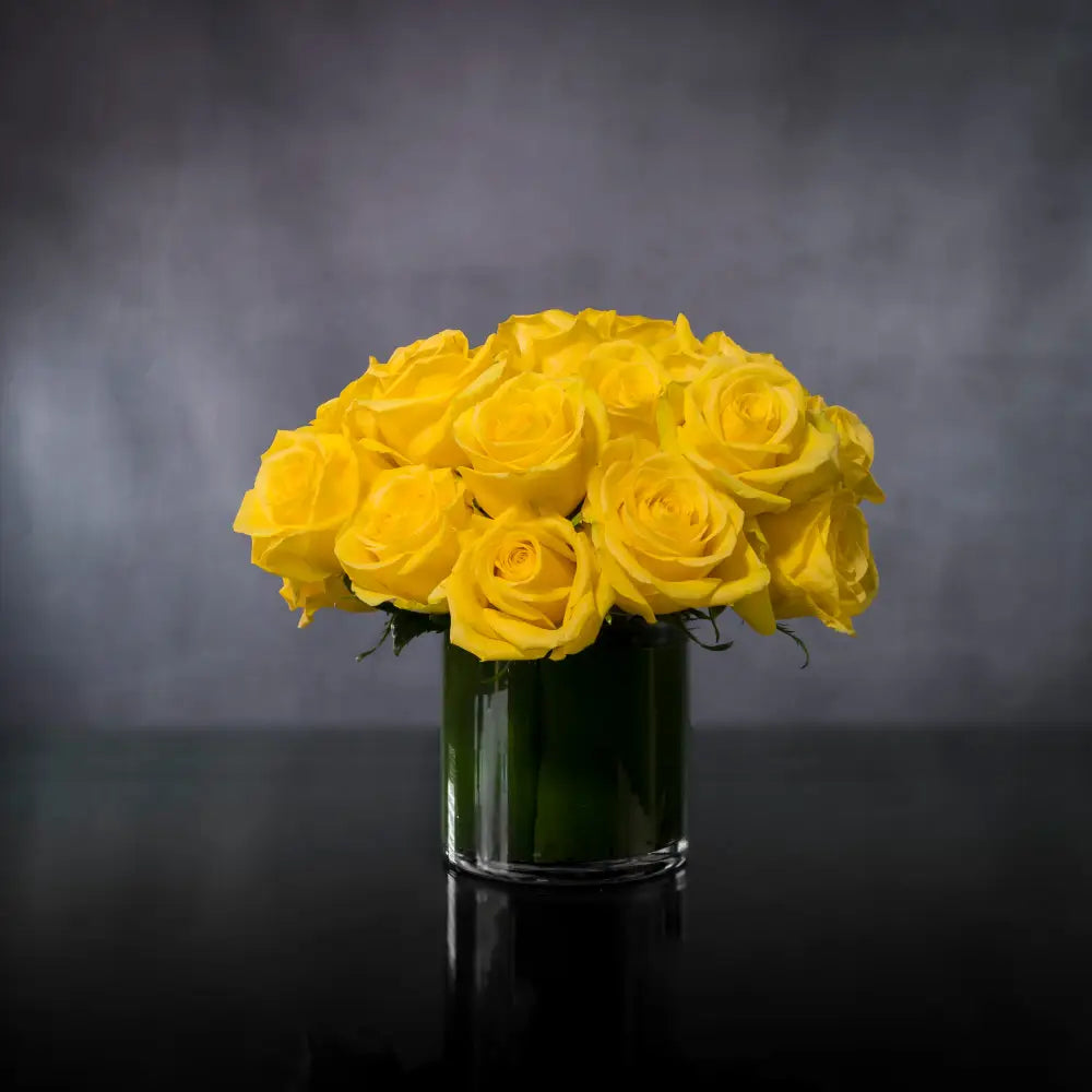 Bright, vibrant, sunny yellow Roses, the color of friendship, are sure to brighten anyone's day. Send good wishes and happiness with a dozen lovely yellow roses clustered in a glass vase.