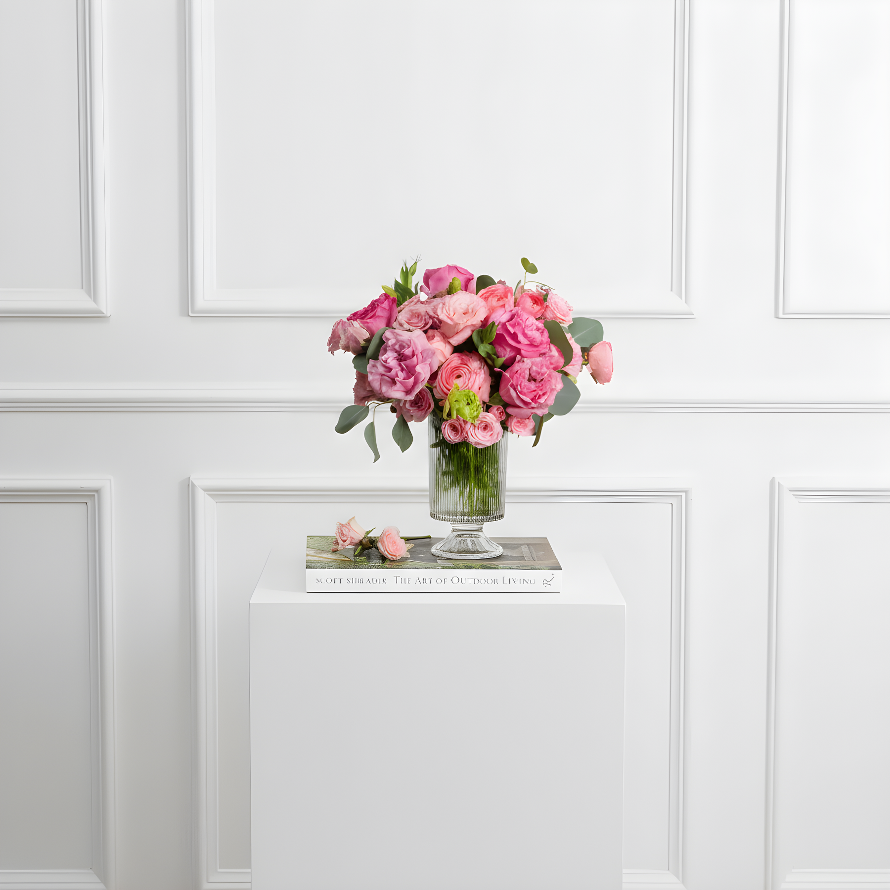 A Case of Hot Fever showcases an enchanting blend of luxurious garden roses and delicate ranunculus, arranged with sophistication in a tall circular glass vase (10" diameter). This romantic bouquet is designed to captivate with its elegance, freshness, and charm, making it the perfect gift for any occasion, from romantic gestures to grand celebrations.