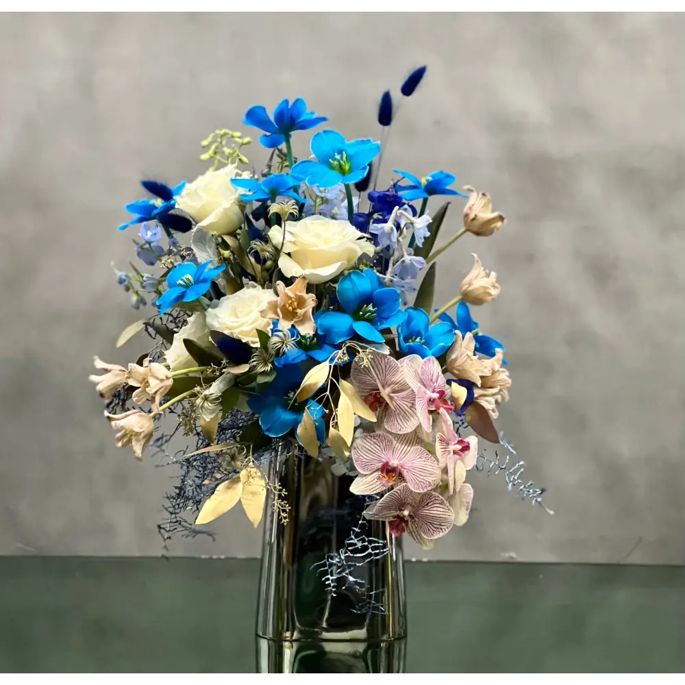 Beverly Hills Florist presents Blue Monday for same day delivery. This beautiful arrangement consists of white roses, blue tulips, orchids, and other complimentary floral to make this floral really standout. This floral piece is then placed into a modern glass