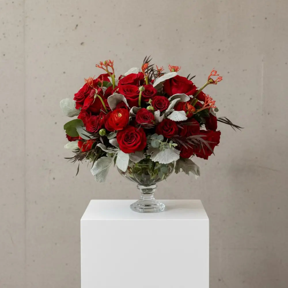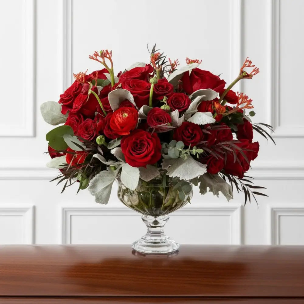 red roses rananculus and greens in a urn vase for the modern home