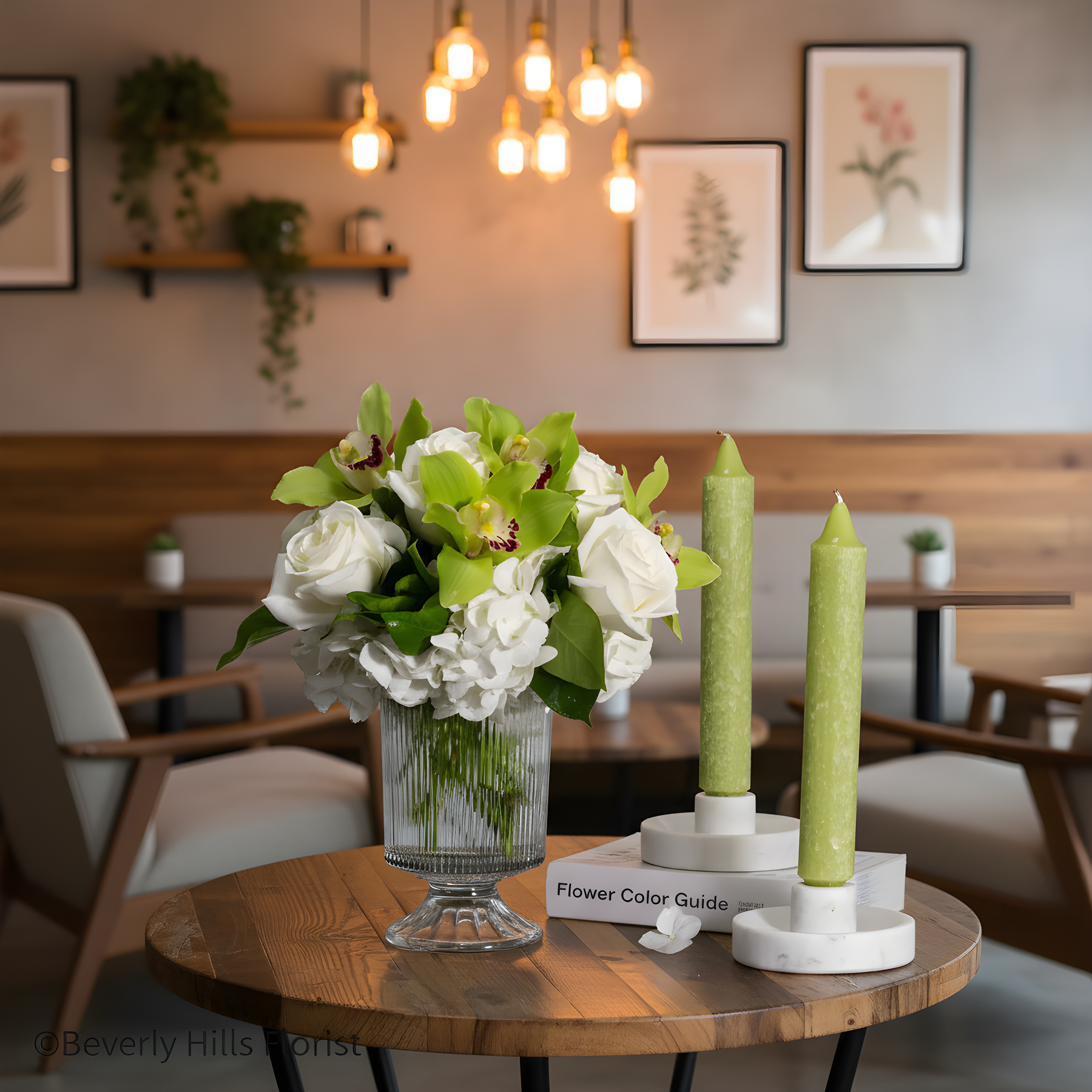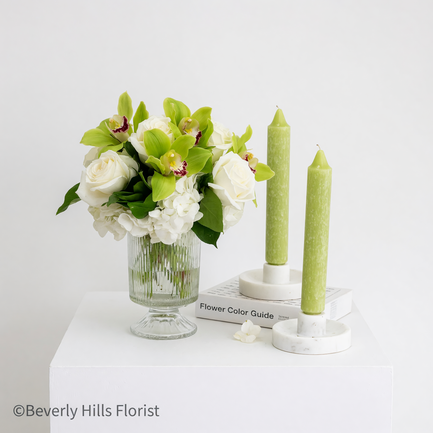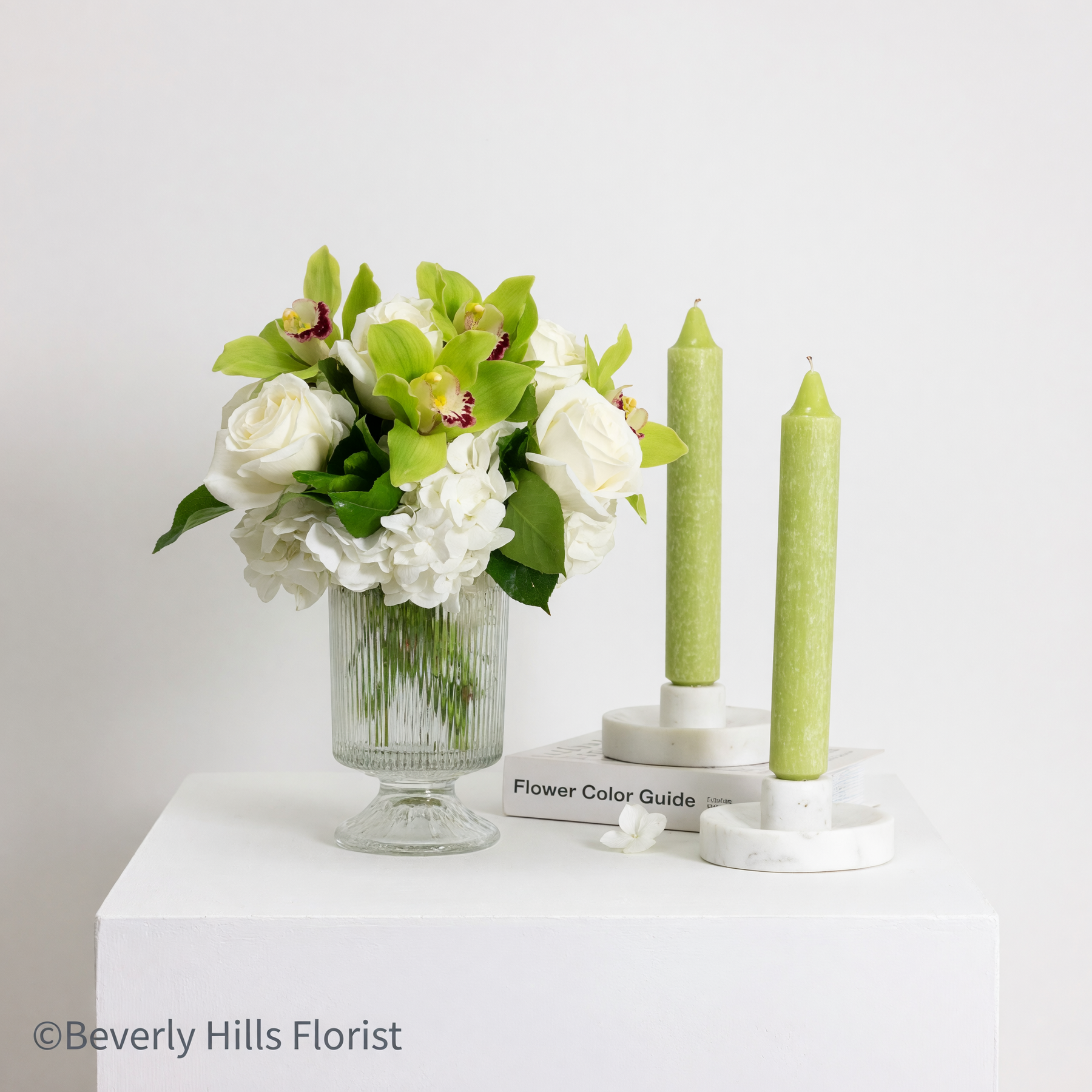 Immerse yourself in the epitome of sophistication with our same-day delivery service to these prestigious Los Angeles locales: Beverly Hills, Santa Monica, West Hollywood, Malibu, Pasadena, Bel Air, Pacific Palisades, Culver City, Brentwood, and Hollywood Hills. Our skilled floral artisans craft exquisite arrangements using only the freshest green and white blooms, hand-picked daily to ensure unparalleled quality. Let us elevate your surroundings with the timeless elegance of nature's beauty, delivered straight to your doorstep with our exclusive Designer's Choice selection.
