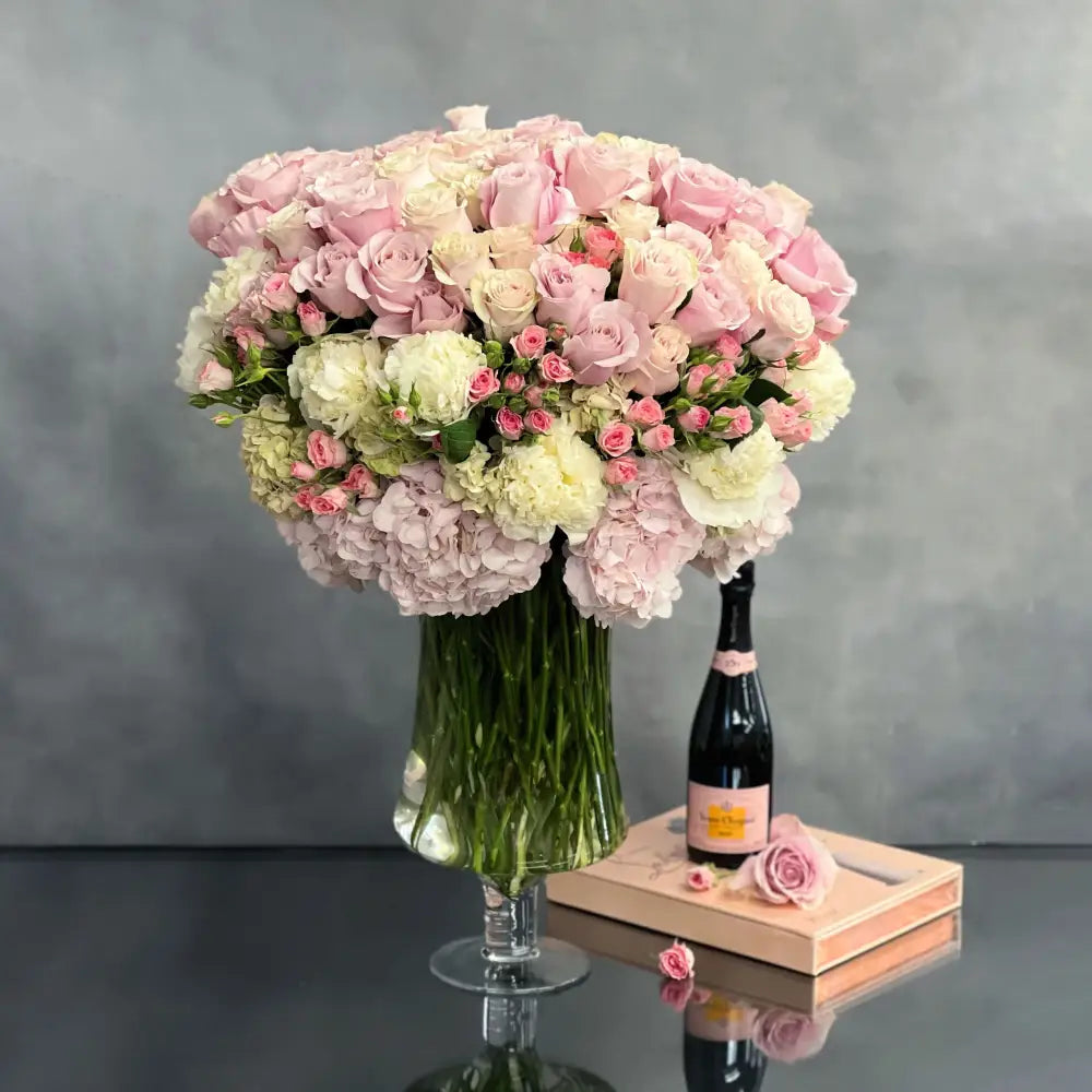 Experience timeless elegance with this breathtaking arrangement of over 100 pale pink roses and peonies. Designed by a top-tier Beverly Hills florist, this 28-inch floral masterpiece is meticulously arranged in a sleek, transparent glass vase that complements the opulence of the blooms. Perfect for lavish events or as a luxurious gift, this arrangement symbolizes love, prosperity, and enchantment. Same-day delivery available for Beverly Hills and nearby areas.