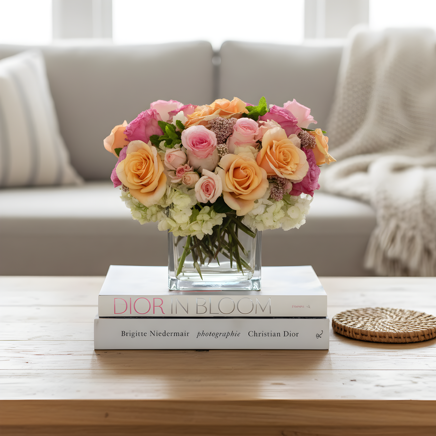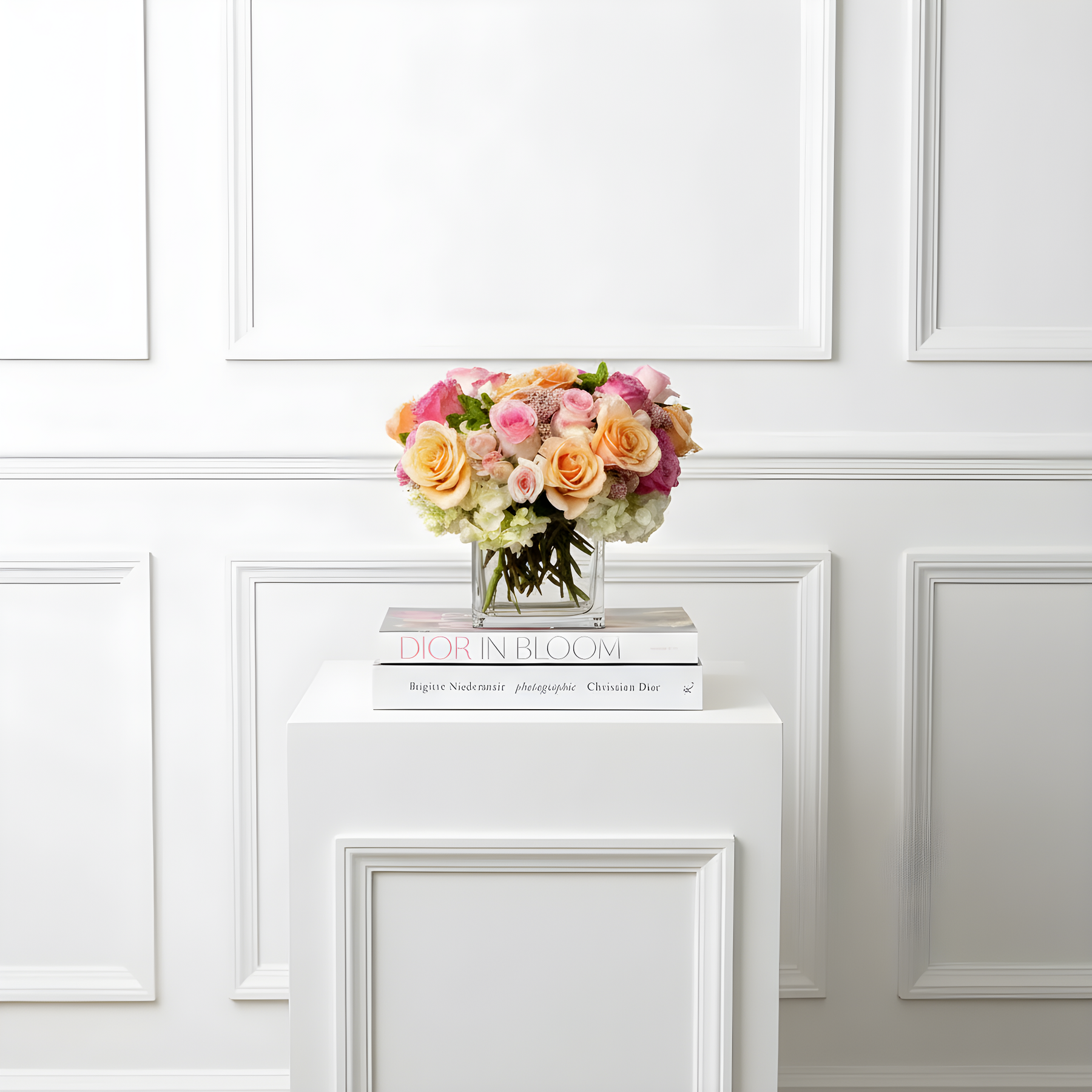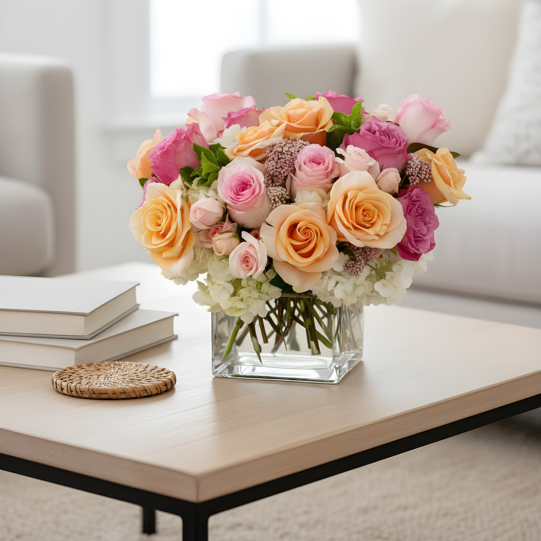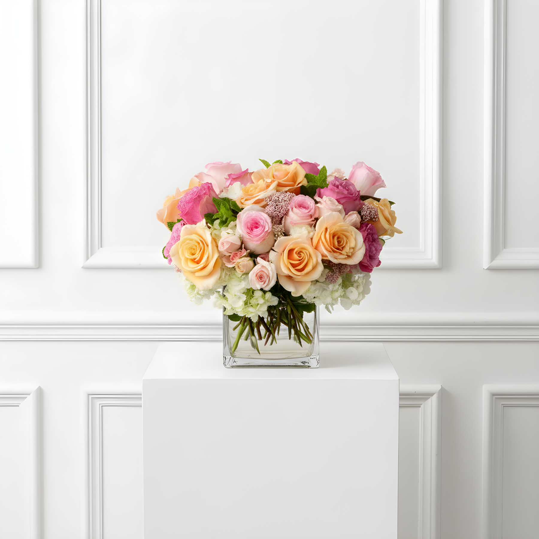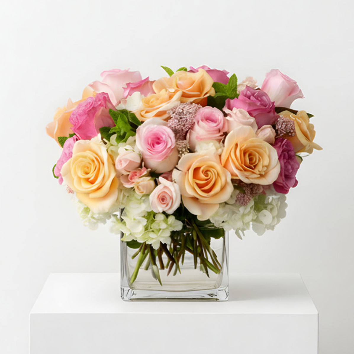 Delicate and angelic... this beautiful mix of roses, Imported Ecuadorian Roses, Dutch Spray Roses and Rice Flowers in a Glass vase brings charm and beauty in any room. Its perfect for any gift-giving occasion or celebration.