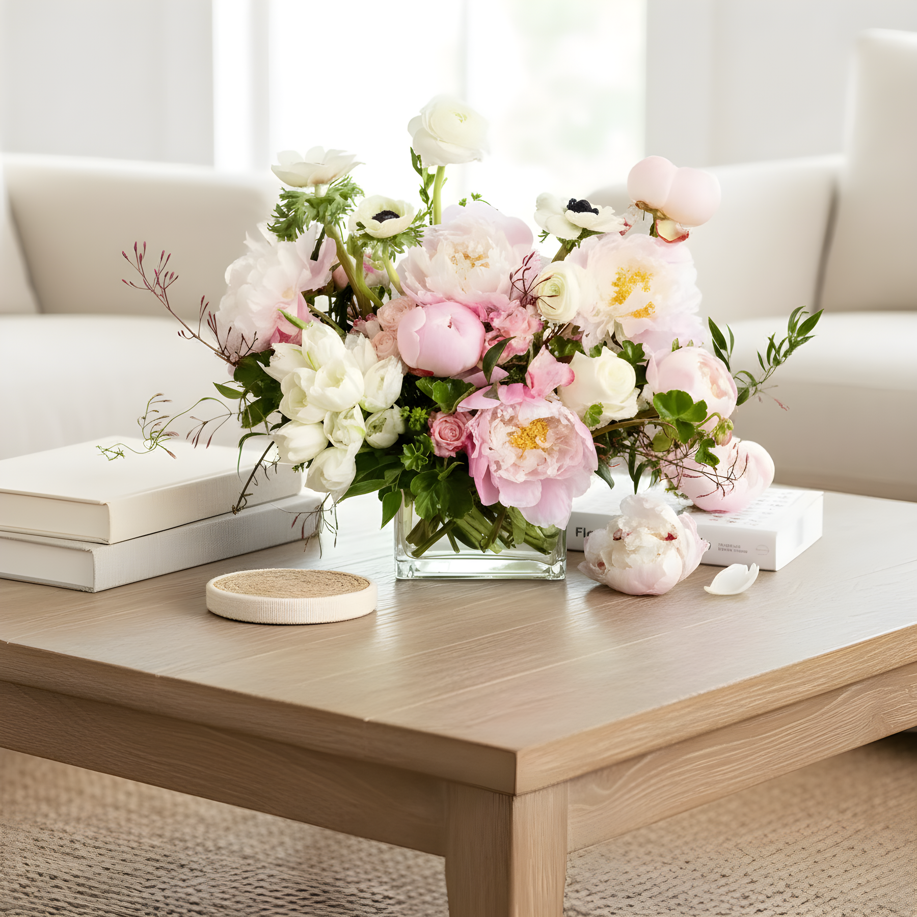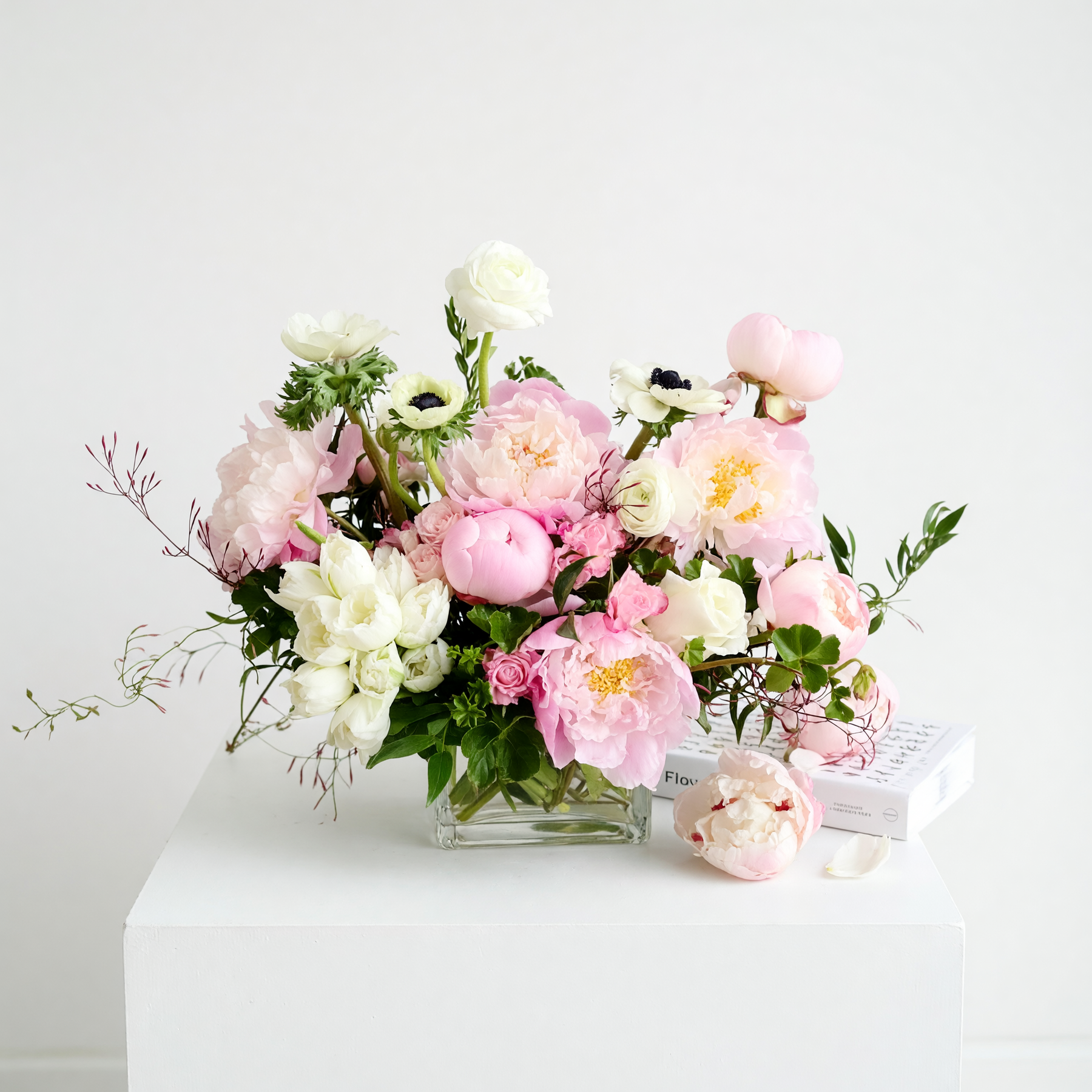 Make this day their best day. Our expert floral designer handcrafted this wonderful array of white Anemonies, pink Peonies, white tulips and pink Roses in a rectangular glass vase to create a celebration in bloom. Perfect to give for a special reason or to simply share a smile.
