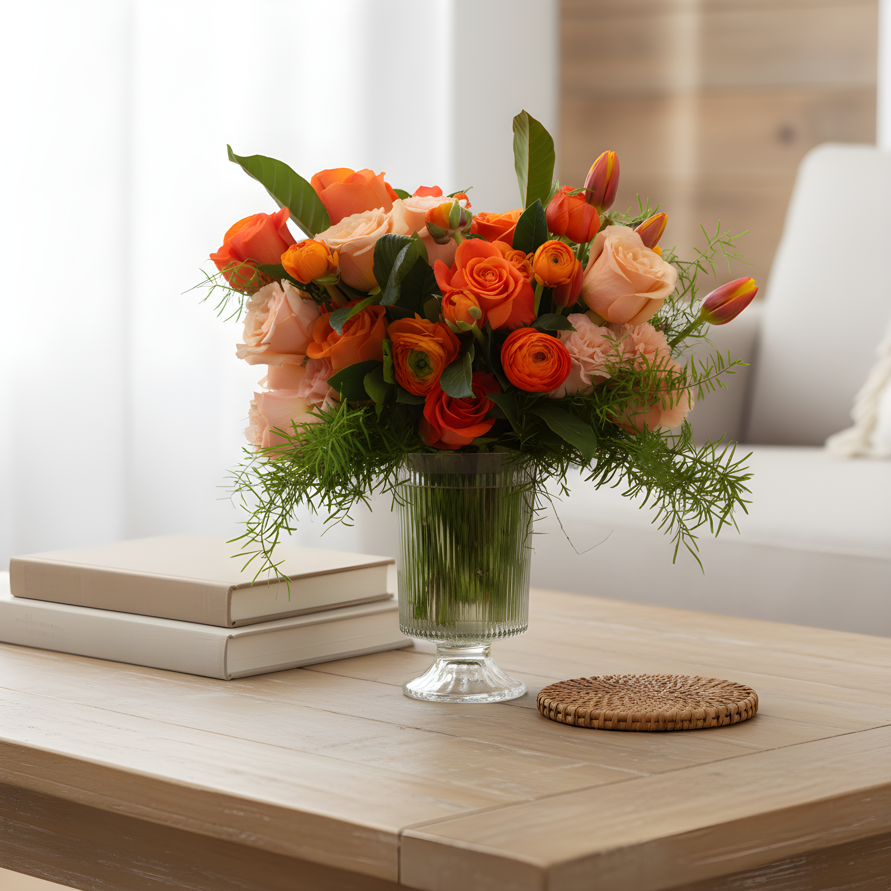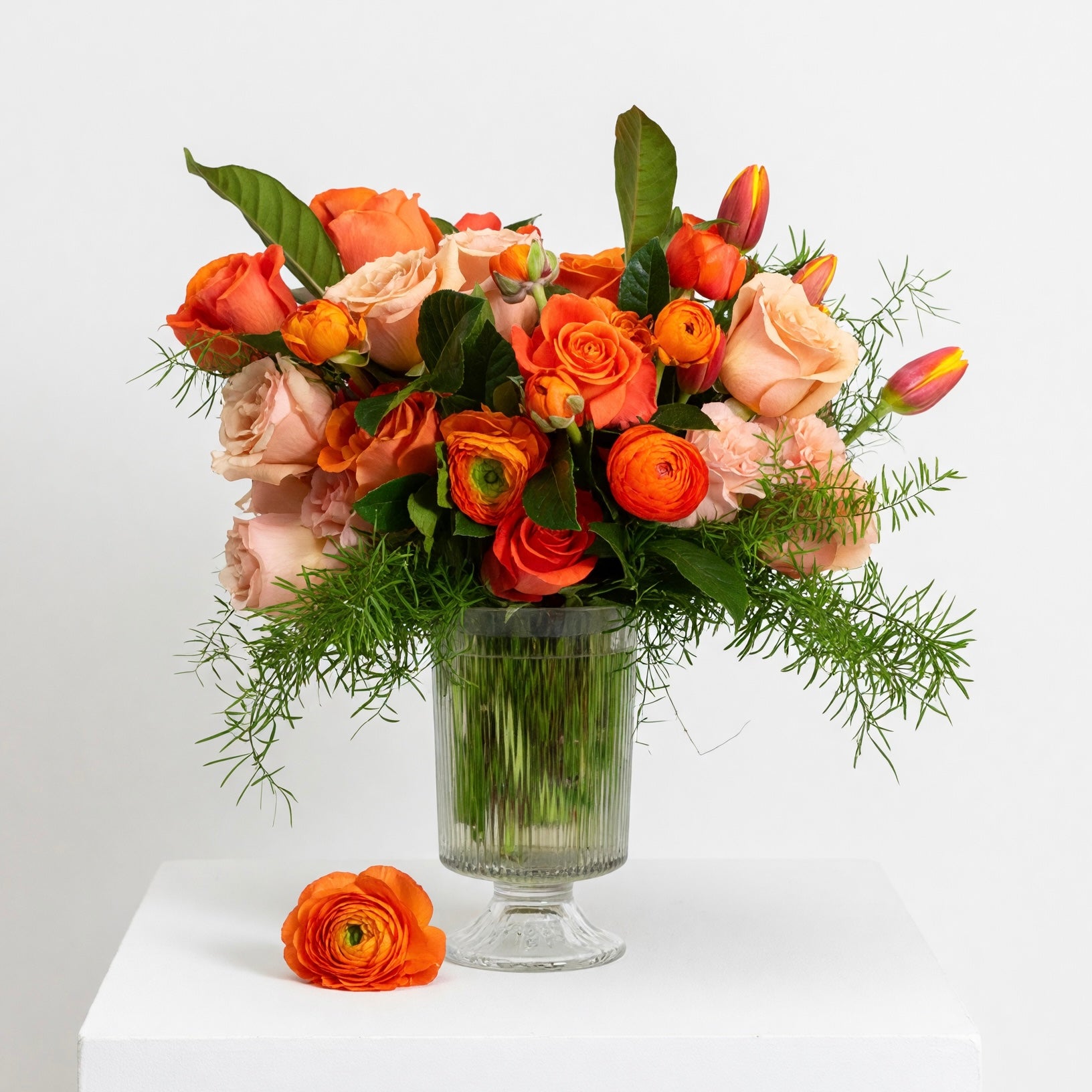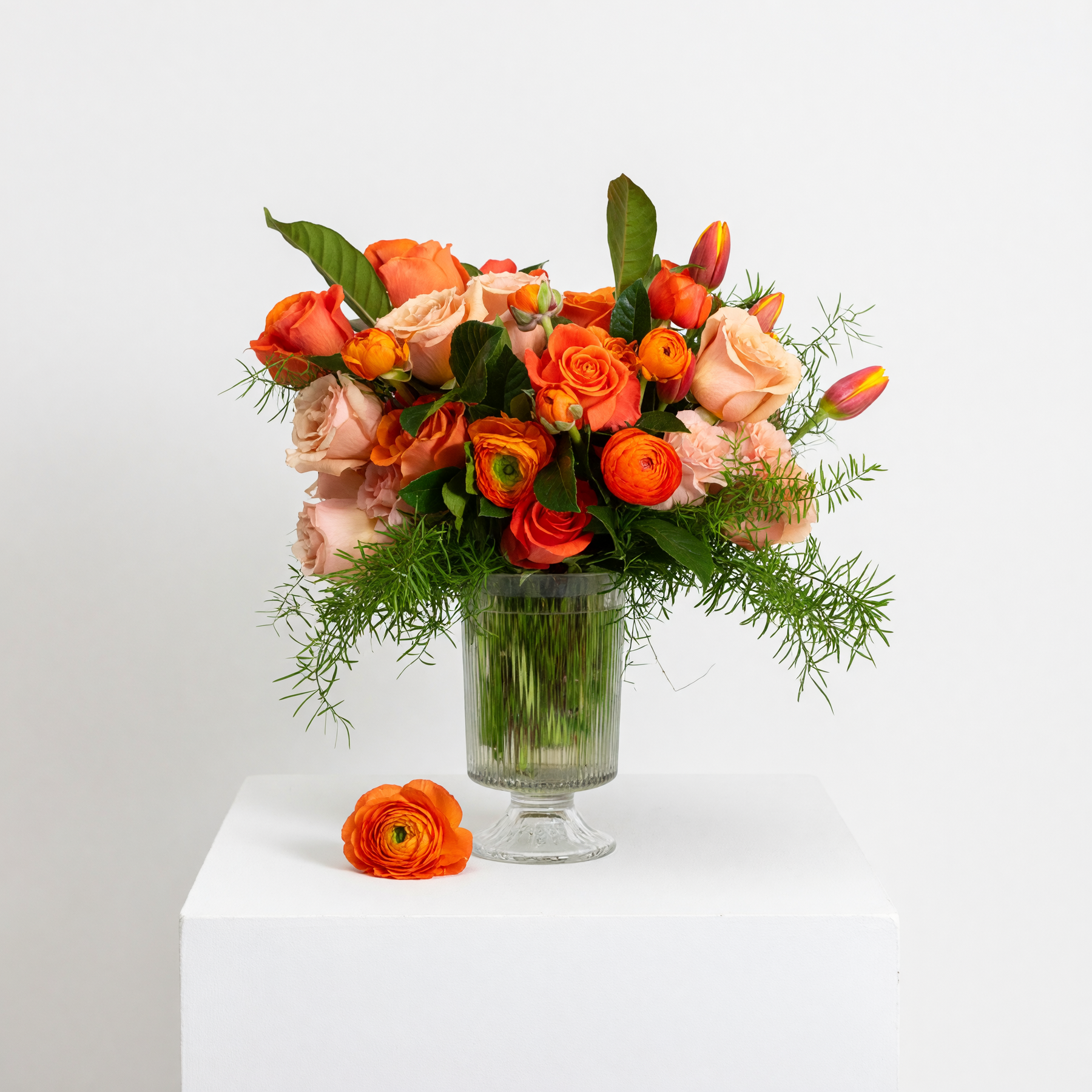 Embrace the vibrant allure of Tangerine Tango, where the warmth of tangerine hues meets the whimsy of seasonal blooms. Nestled within a charming short glass vase, this arrangement exudes a lively energy, showcasing an array of orange floral shades dancing harmoniously. Each bloom, hand-selected for its brilliance, invites you on a sensory journey through a sun-kissed garden. It's a radiant burst of color that breathes life into any space, infusing it with the spirit of summer's vibrant embrace.