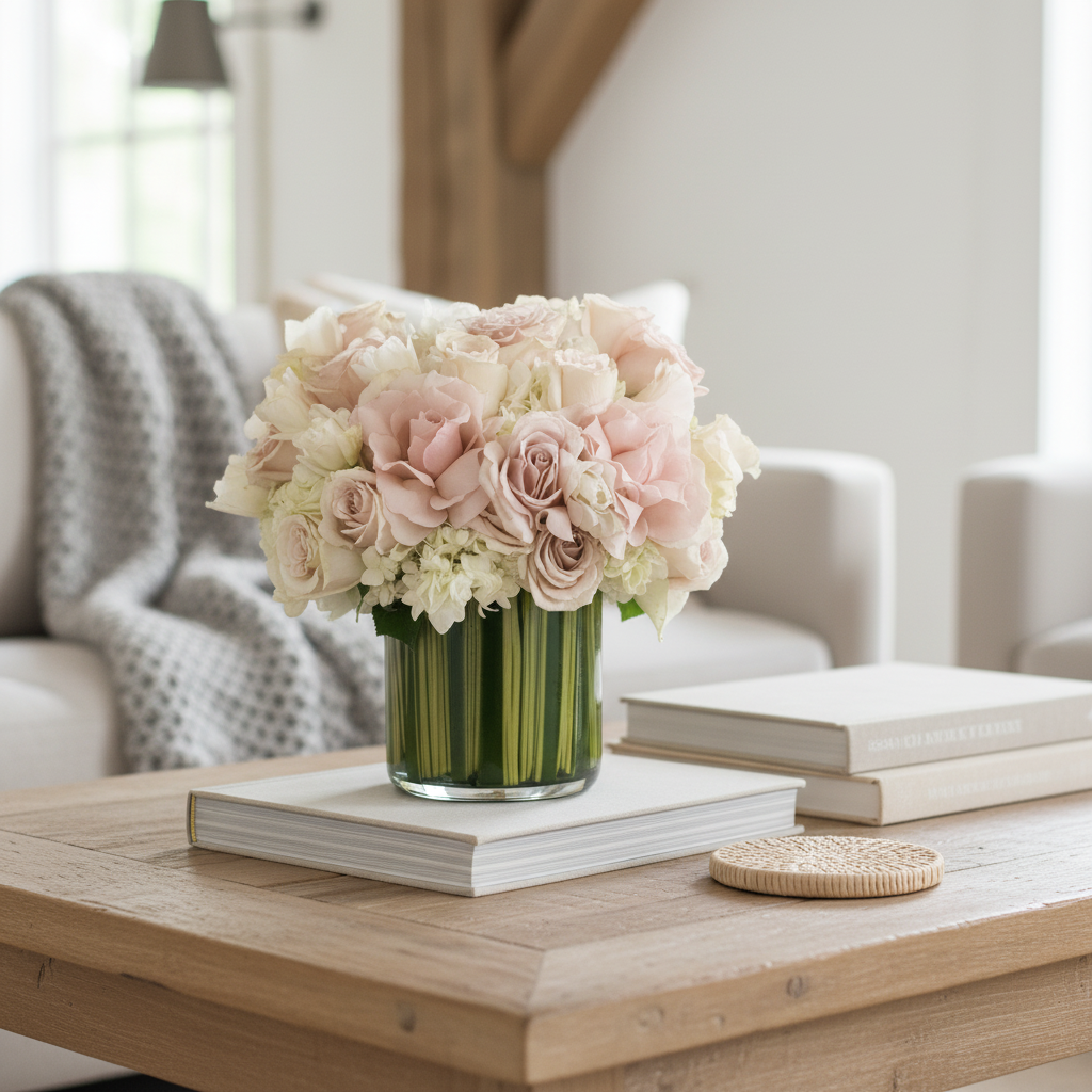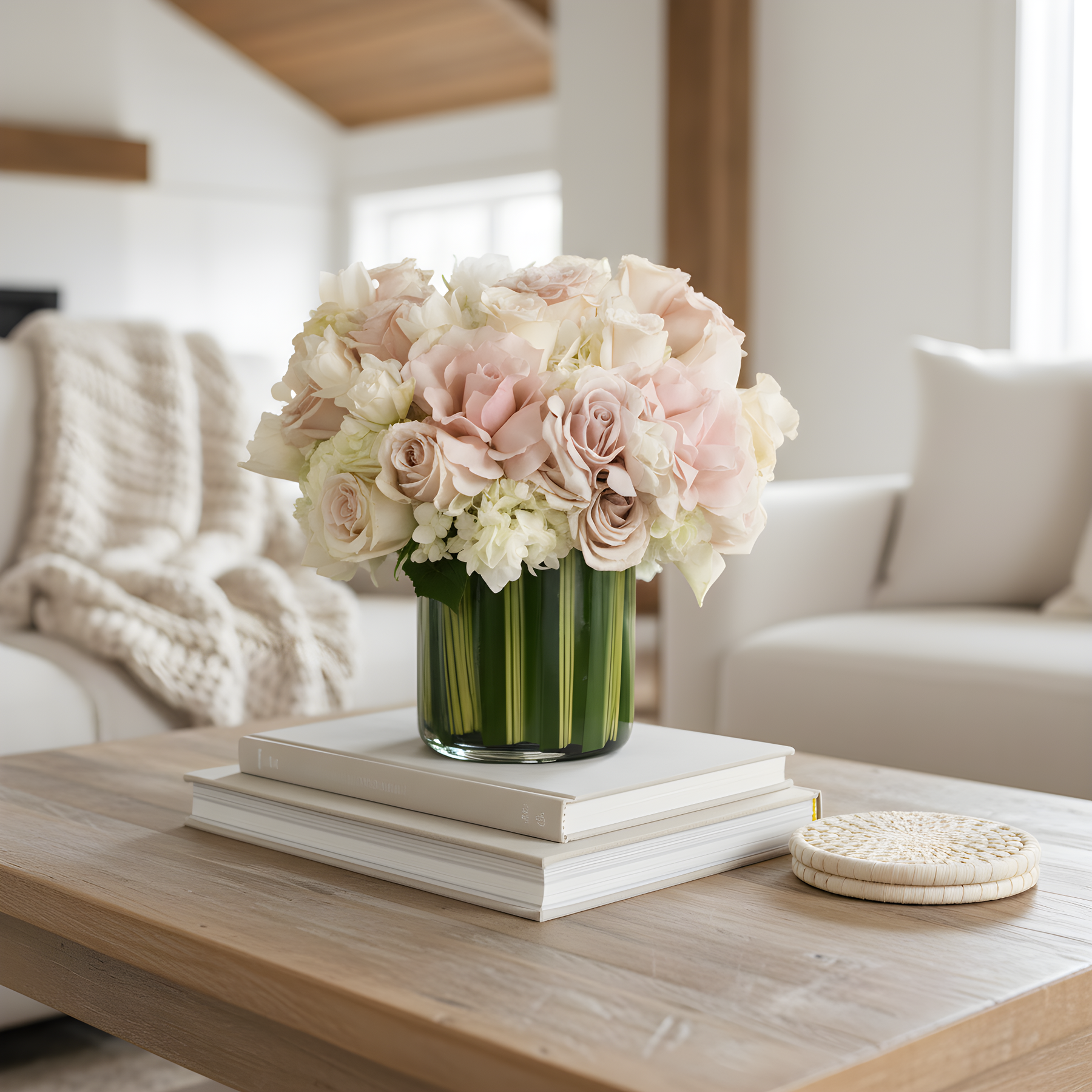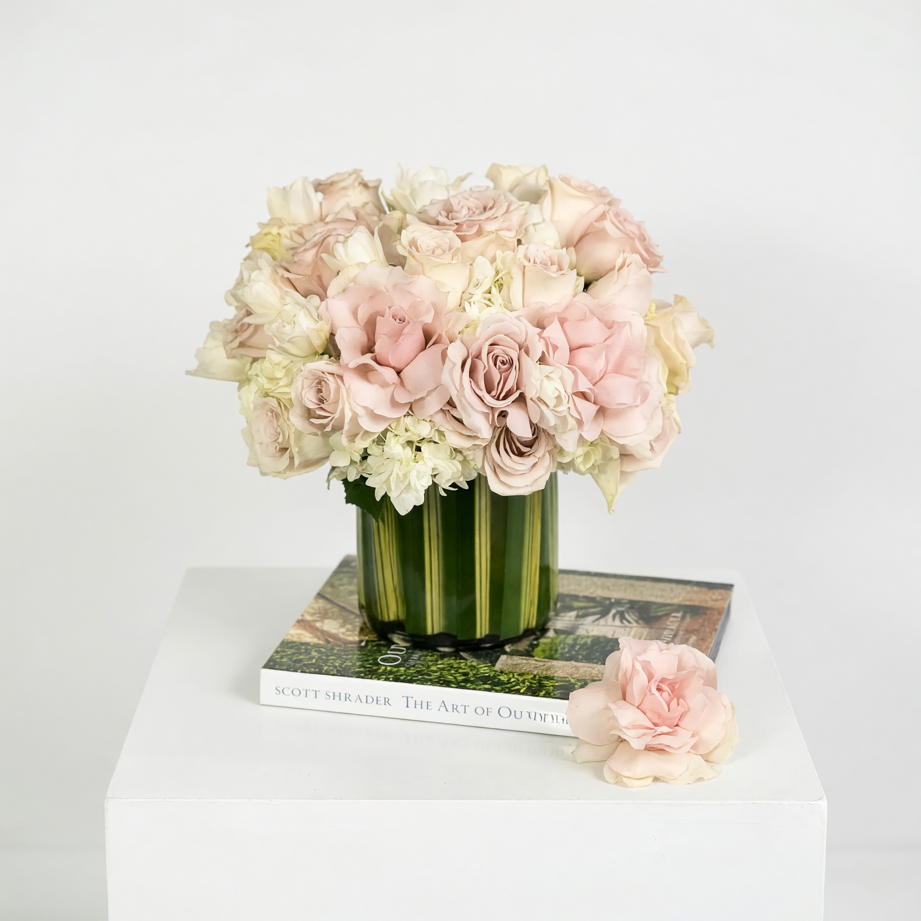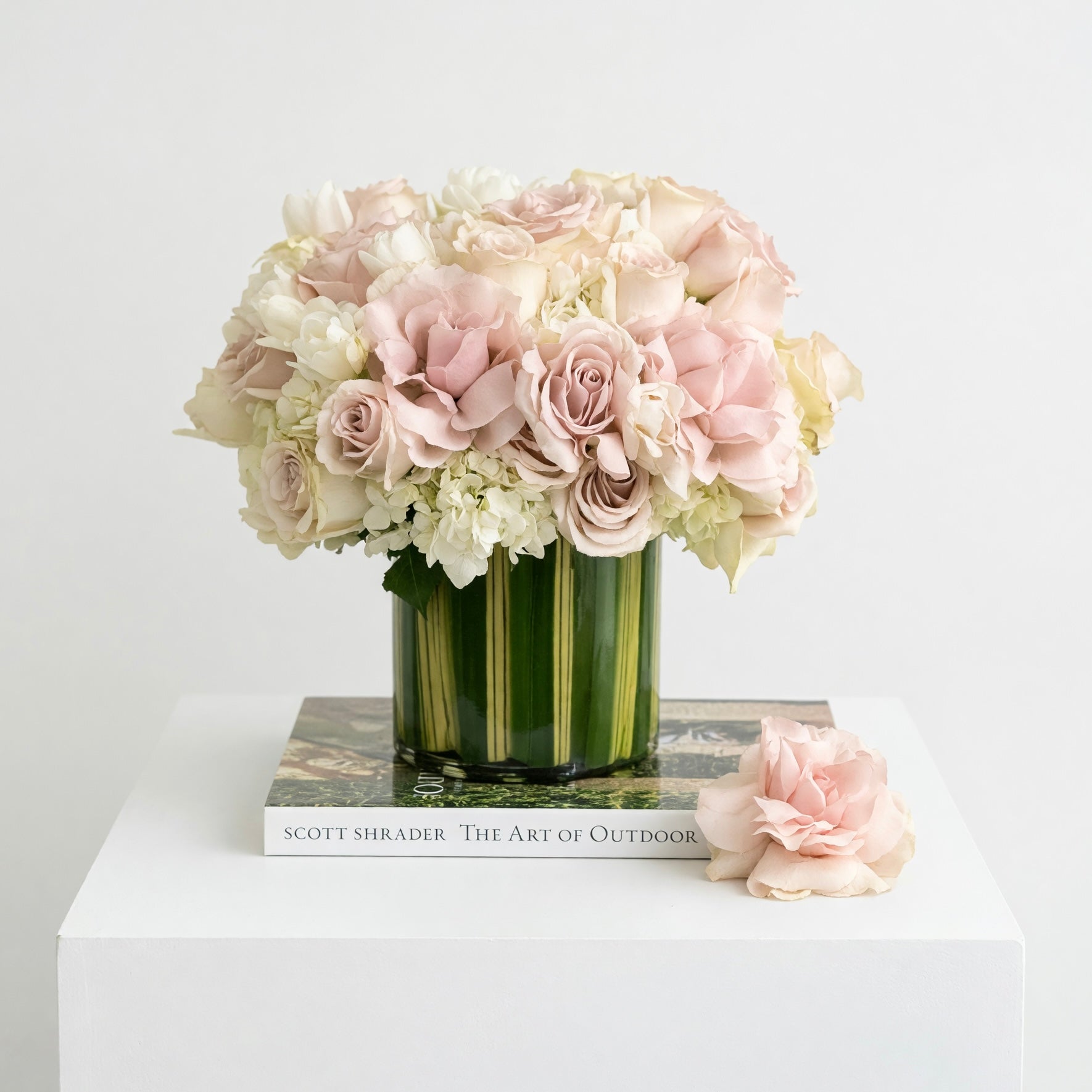 Sophisticated, lush, and fragrant—this luxurious arrangement is the essence of everyday elegance. Designed by Beverly Hills Florist, it features dozens of premium blush roses, tulips, and delicate seasonal blooms artfully arranged with fluffy hydrangeas in a soft, romantic palette.