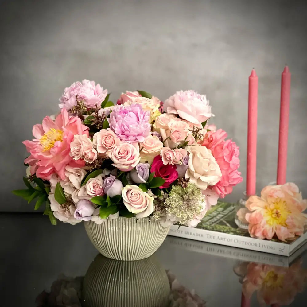 This round dish is abundantly filled with lovely Roses of varying hues and peonies. Dainty clusters of light pink Hydrangea add to the texture and fullness of this precious design. Send your sweet sentiments with this special gift. A beautiful and current interpretation of a classic gift, this gorgeous bouquet of Luscious Roses and peonies surrounded by light pink Hydrangea is sure to bring joy and delight your special someone. Send your sweet sentiments with this breathtaking gift!
