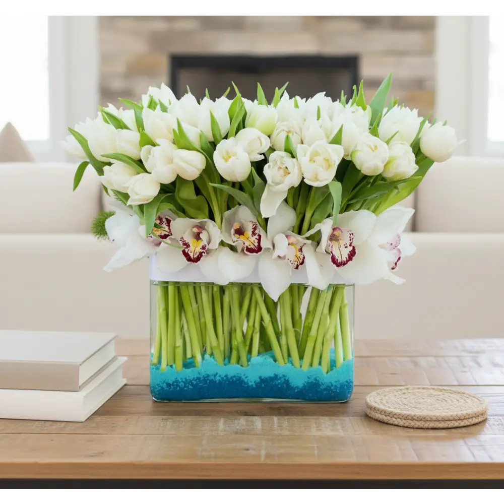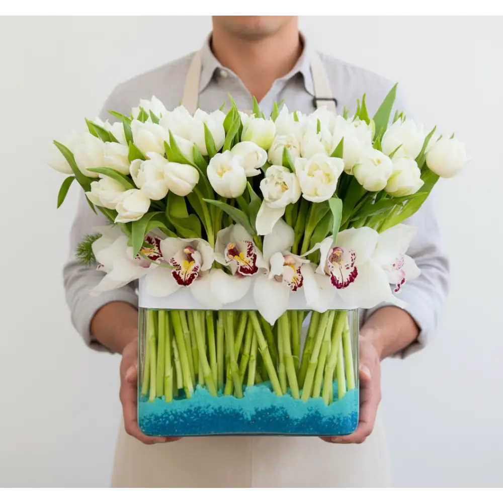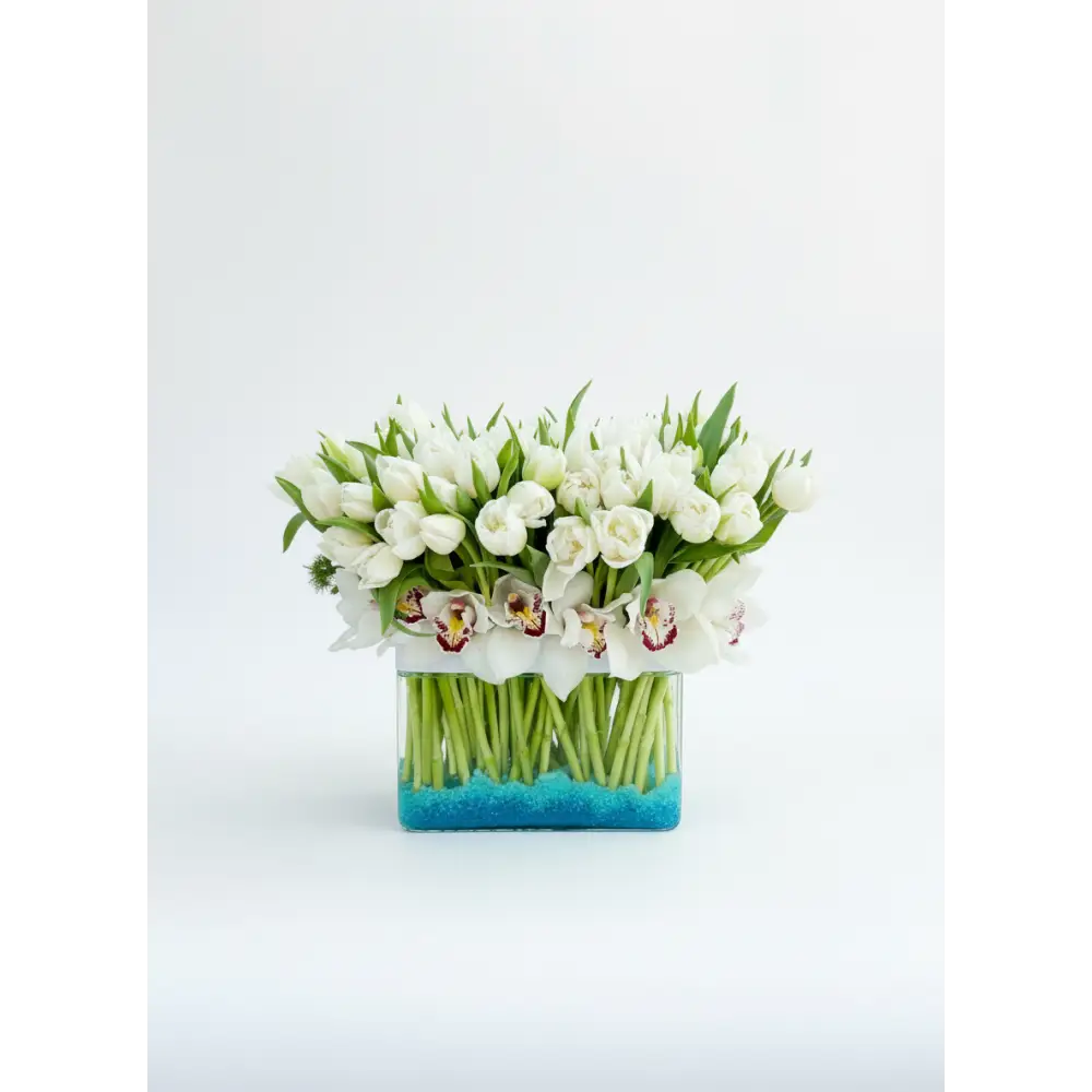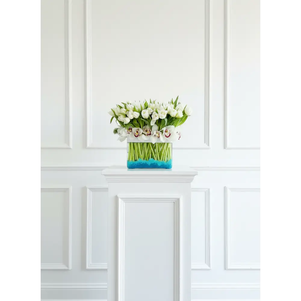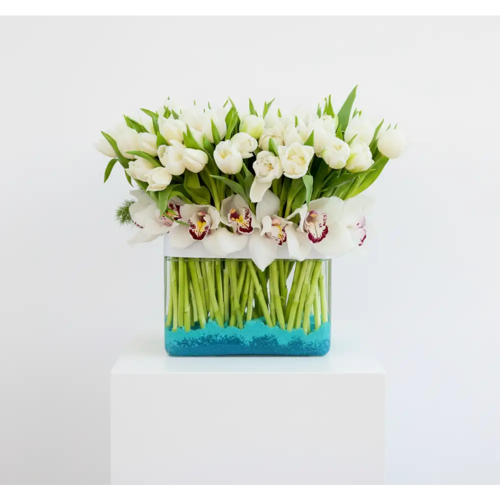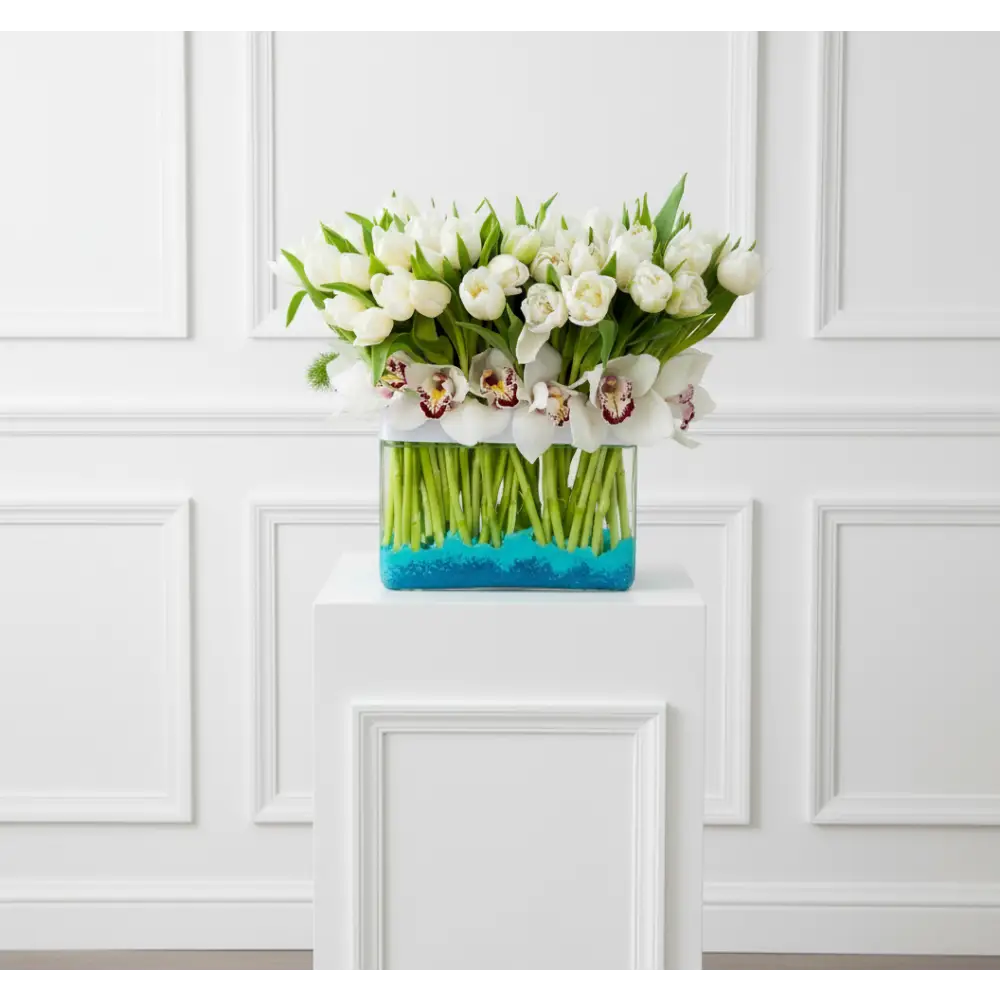 My Beverly Hills Florist offers same day delivery for our White Goddess. As magical as a moon dance. White Dutch tulips are balanced by exotic green orchids in this gorgeous green and white arrangement. It makes a chic statement in a clear globe vase. our Standard includes 80 Tulips, Deluxe includes 100 and our Premium 150 Tulips.